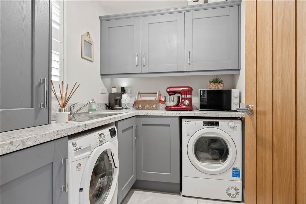 With a range of eye and low-level fitted units, stainless-steel sink unit and drainer with stainless-steel mixer tap. Plumbed for washing machine. Space for tumble dryer. Tiled flooring.