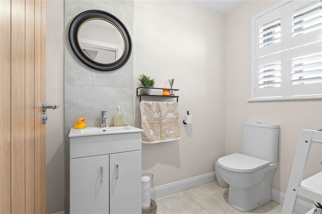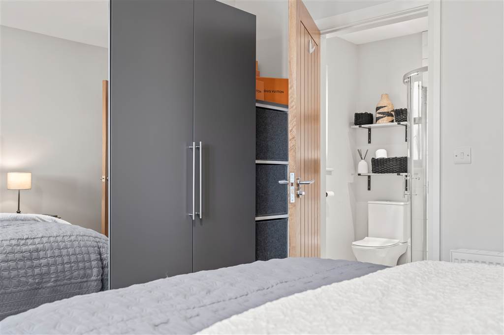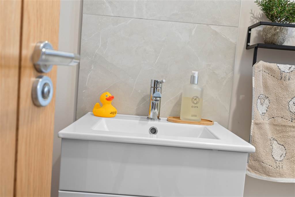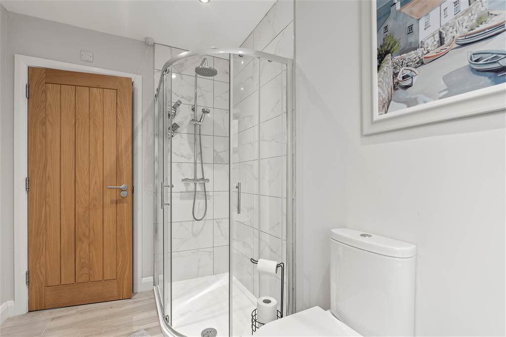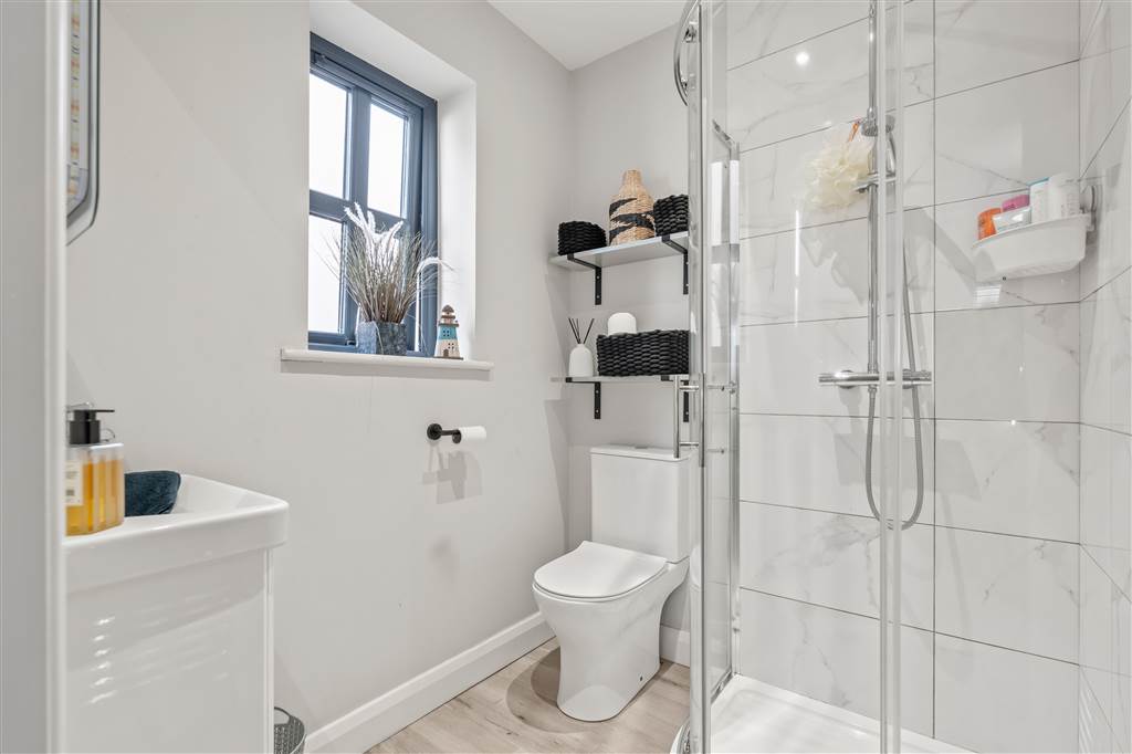With 3-piece white suite comprising LFWC, WHB with built-in vanity unit and shower to enclosed tiled corner cubicle. Spot lighting to ceiling. Wooden effect tiled flooring.
