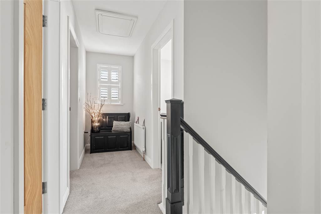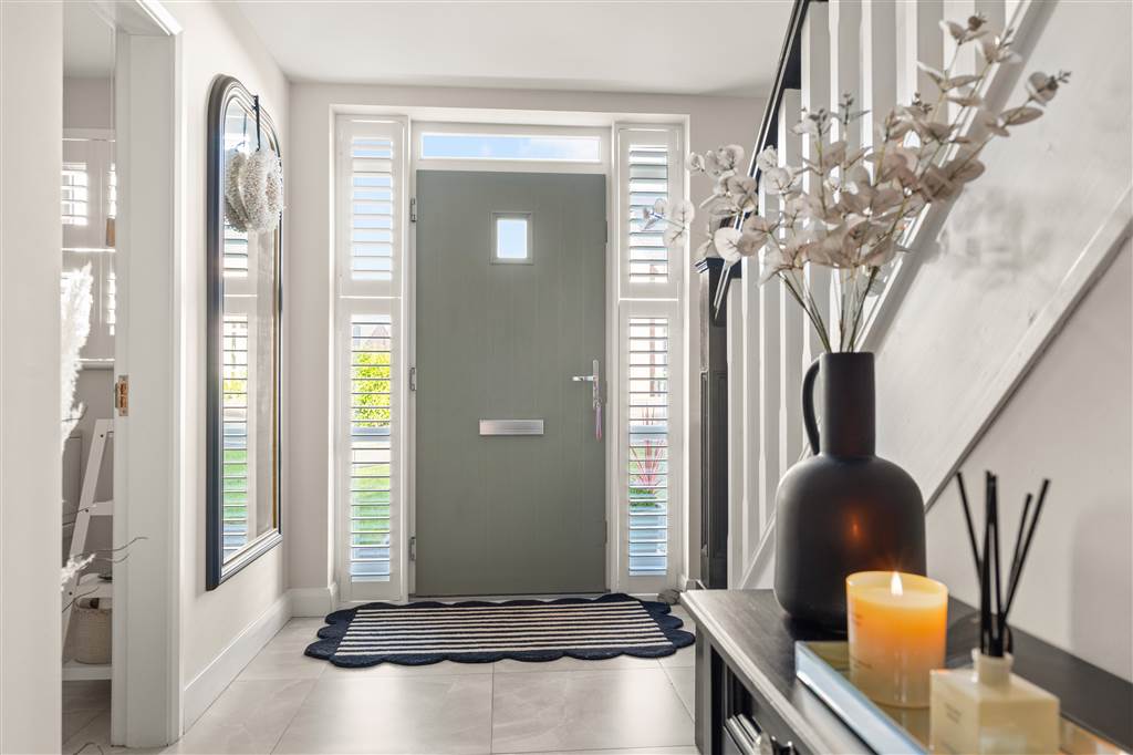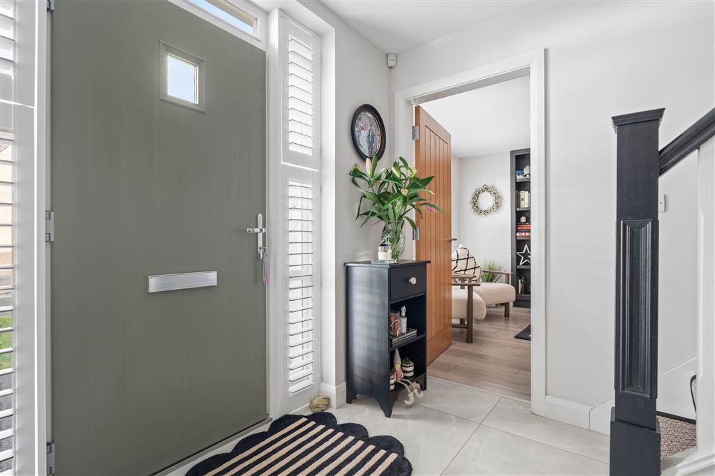 With composite front door with glazed surround. Balustrade staircase. Under stair storage cupboard. Tiled flooring.
