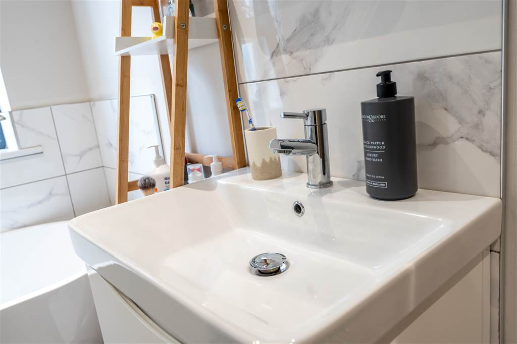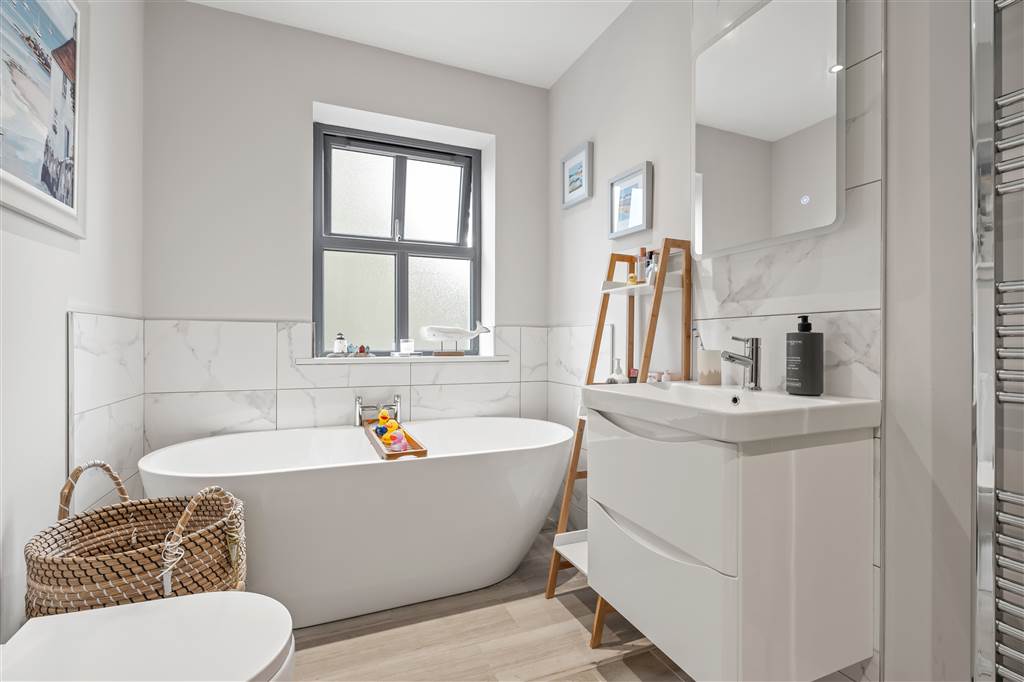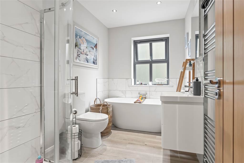 With 4-piece white suite comprising LFWC, WHB with built-in vanity unit, free-standing bath and shower to enclosed tiled corner cubicle. Heated towel rail. Spot lighting to ceiling. Splash back tiling. Tiled flooring.