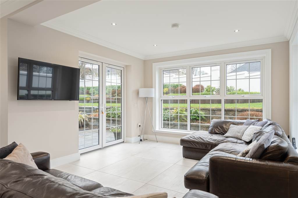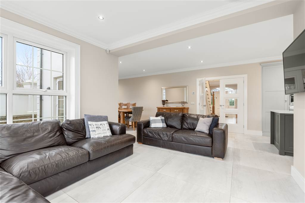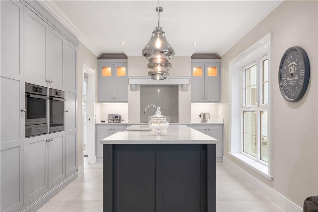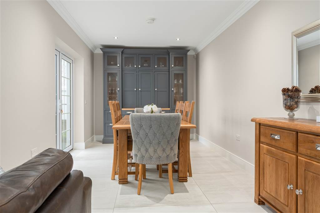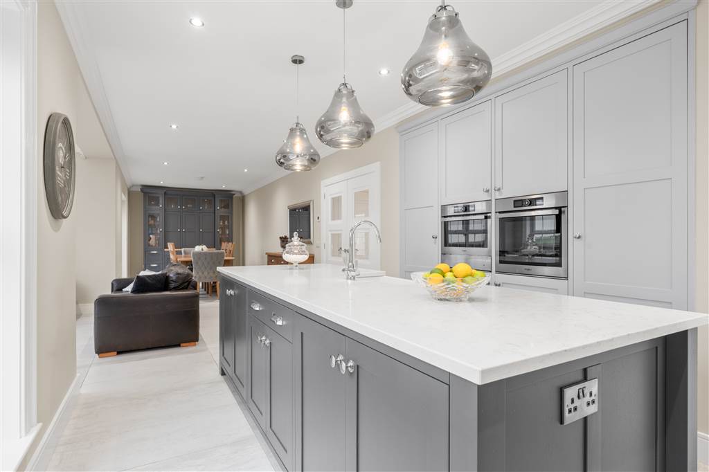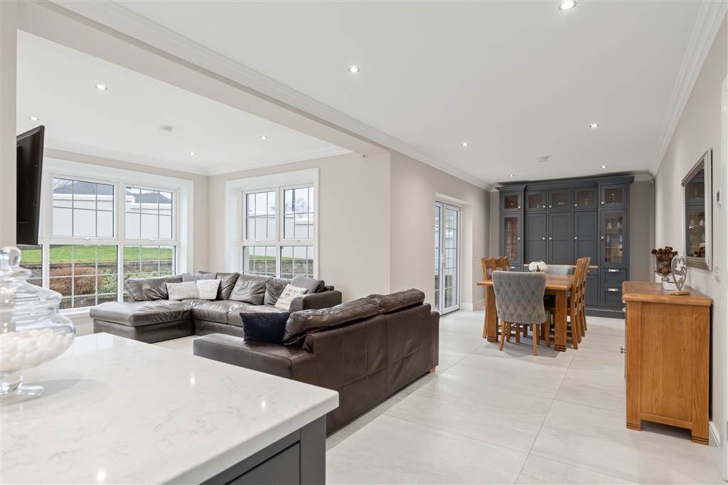 With a range of solid ash painted eye and low-level fitted units with Quartz worktop, Belfast sink with stainless-steel mixer tap. Integrated electric hob with extractor fan over. Integrated double Whirlpool oven with warming drawer. Integrated microwave. Integrated bin drawer. Integrated dishwasher. Integrated fridge. Integrated freezer. Cutlery drawers. Saucepan drawers. Glazed display cupboards. Kitchen island. Spacious open plan dining area. Solid ash painted bespoke built-in unit with glazed display cabinets, shelving and integrated storage cupboards. PVC double doors to rear. Coving to ceiling. Spot lighting to ceiling. Tiled flooring. Open plan to sun room.