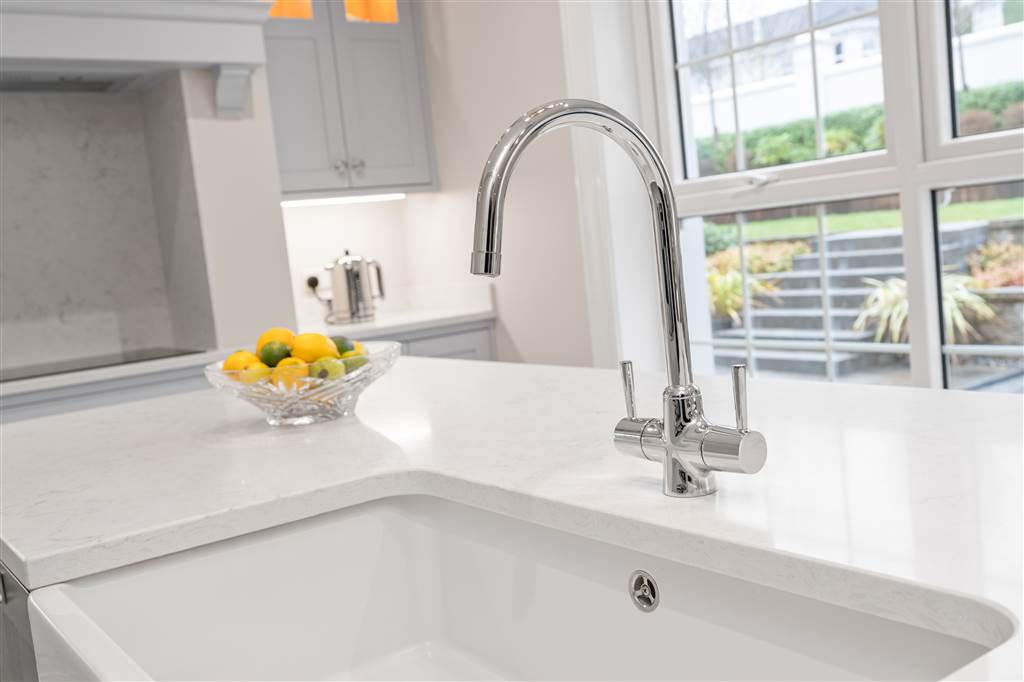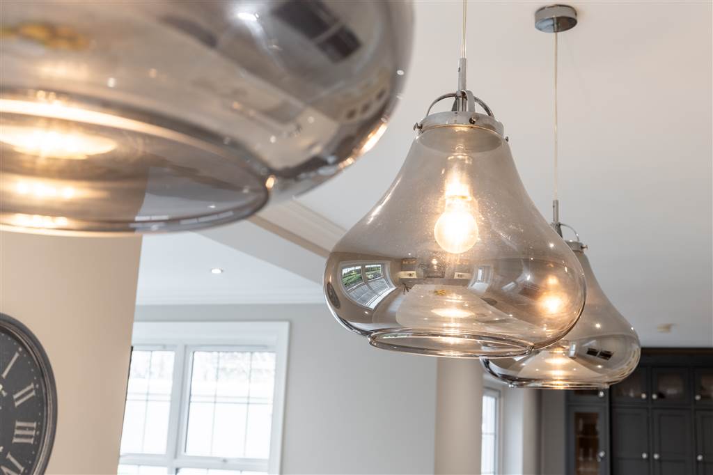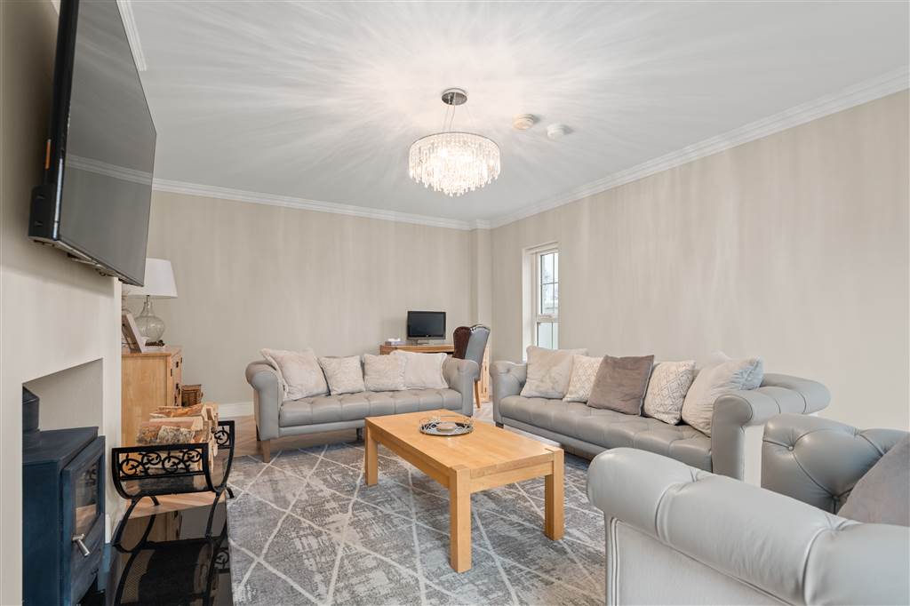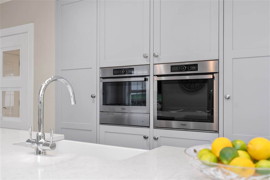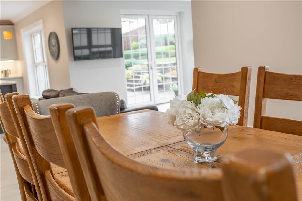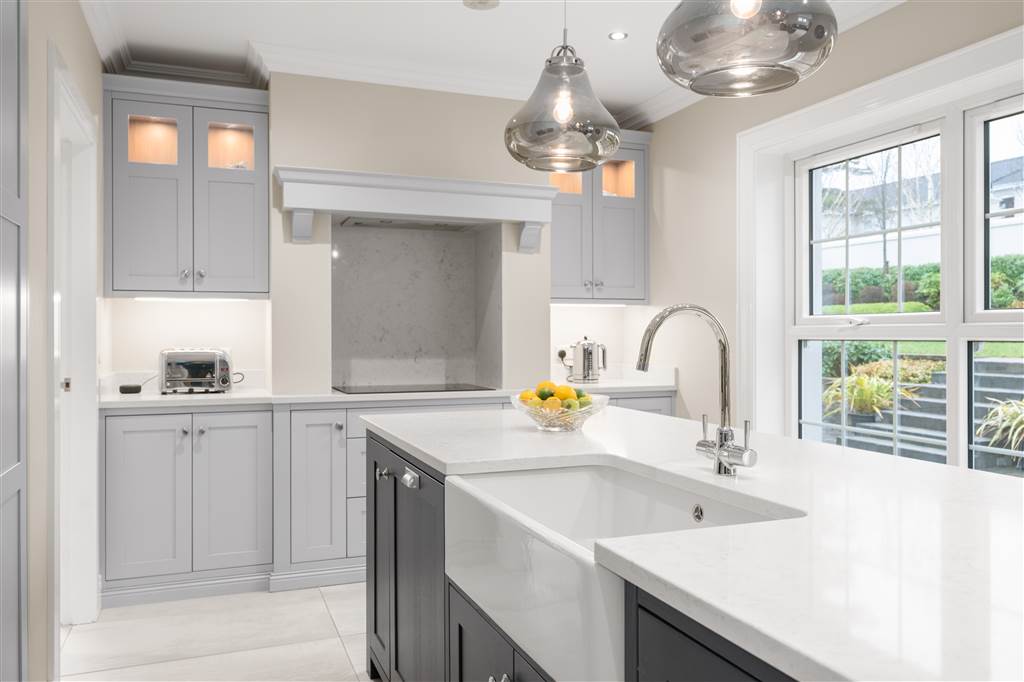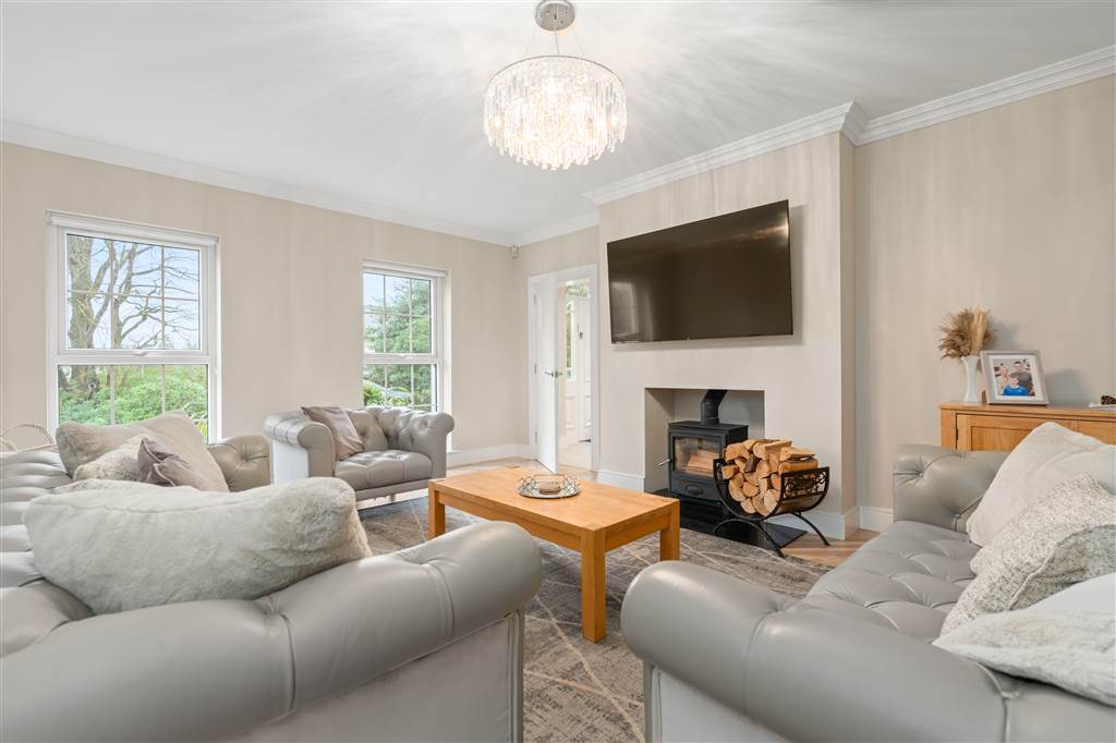 With a range of solid ash painted eye and low-level fitted units with Quartz worktop, Belfast sink with stainless-steel mixer tap. Integrated electric hob with extractor fan over. Integrated double Whirlpool oven with warming drawer. Integrated microwave. Integrated bin drawer. Integrated dishwasher. Integrated fridge. Integrated freezer. Cutlery drawers. Saucepan drawers. Glazed display cupboards. Kitchen island. Spacious open plan dining area. Solid ash painted bespoke built-in unit with glazed display cabinets, shelving and integrated storage cupboards. PVC double doors to rear. Coving to ceiling. Spot lighting to ceiling. Tiled flooring. Open plan to sun room.