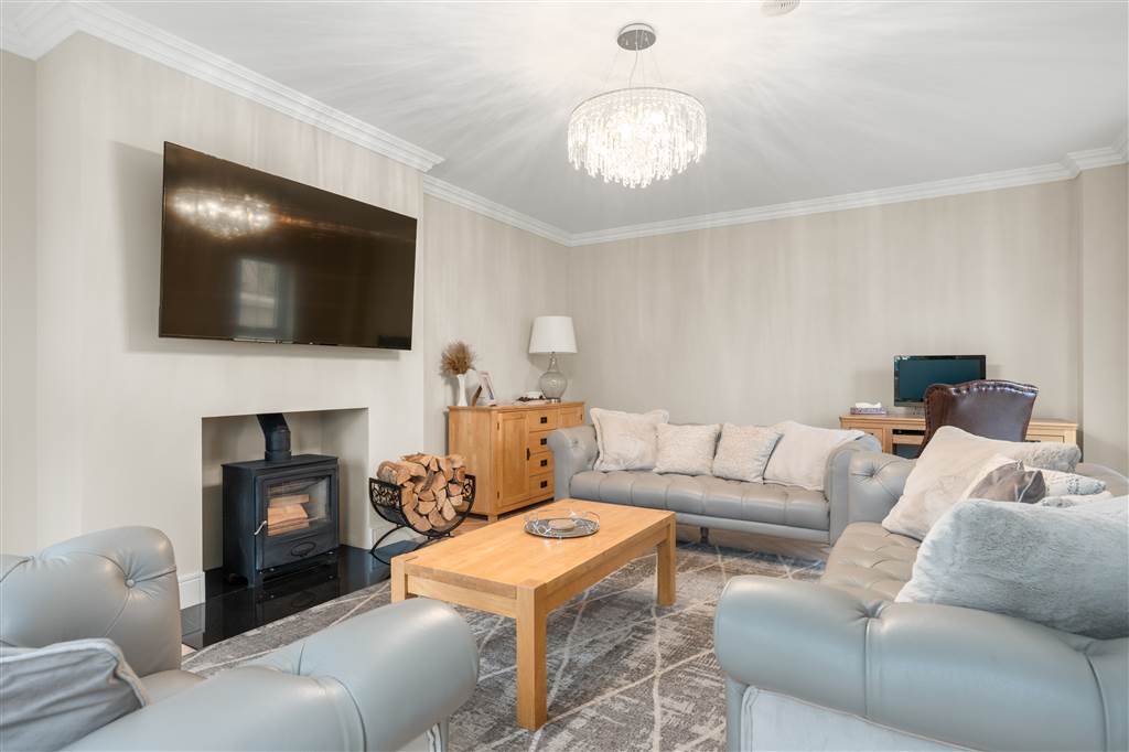 With Hamlet wood burning stove to granite hearth. Coving to ceiling. Herringbone wooden flooring.