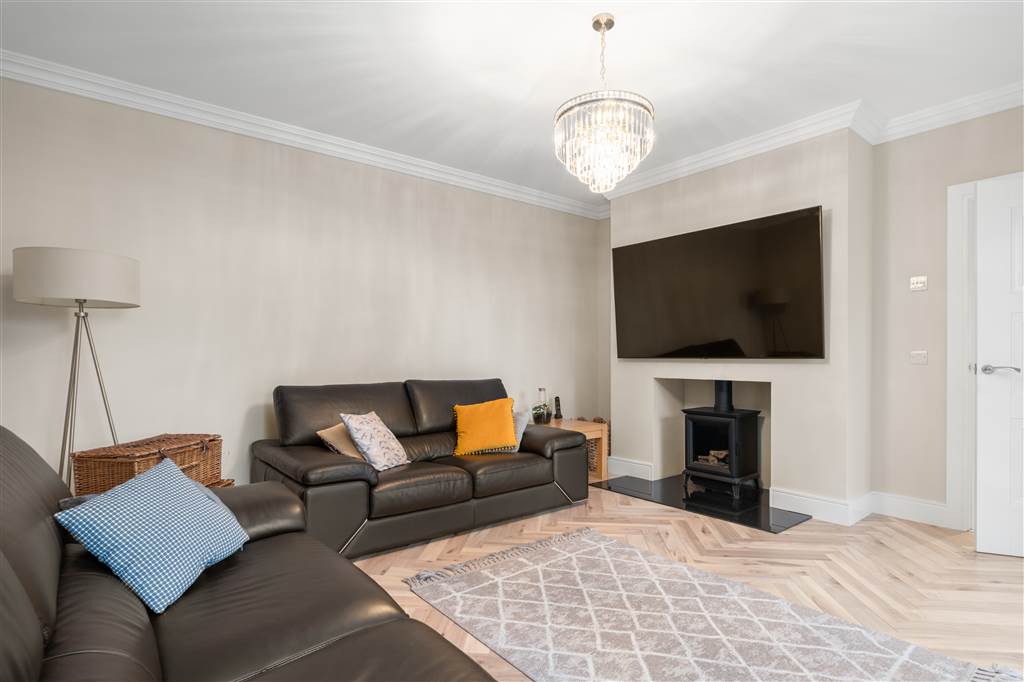 With Gazco remote controlled gas stove to granite hearth. Coving to ceiling. Herringbone wooden flooring.