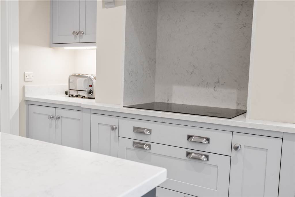 With a range of eye and low-level fitted units with Quartz worktop, stainless-steel sink unit with stainless-steel mixer tap. Plumbed for washing machine. Space for tumble dryer. Tiled flooring. PVC door to rear.