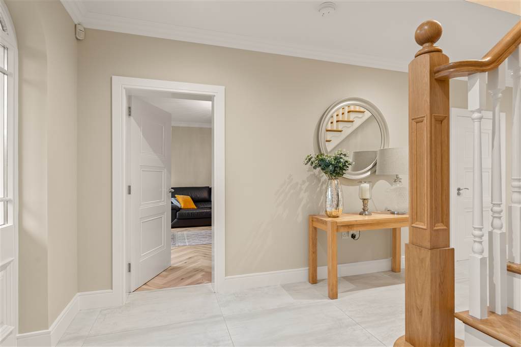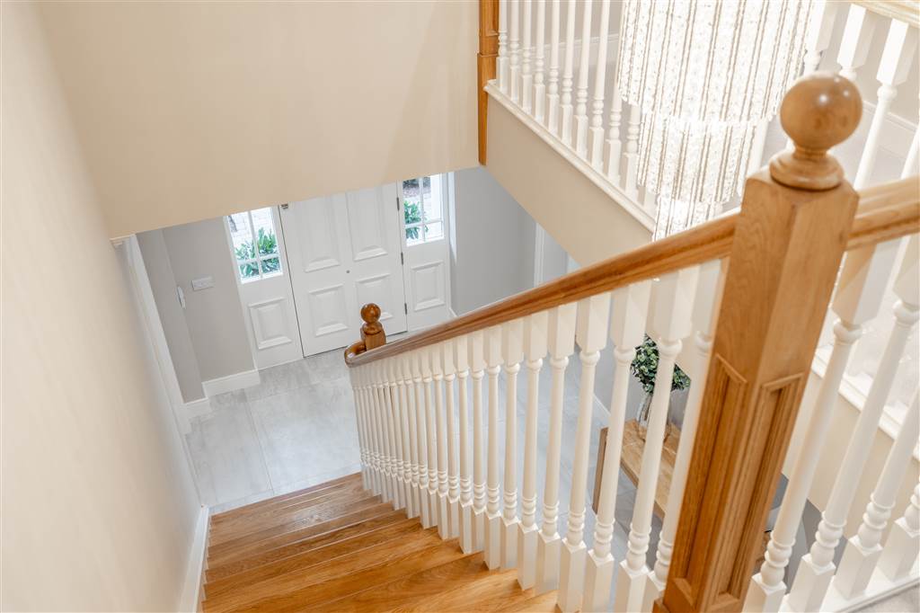 With composite front door with decorative glazed surround. Solid Oak balustrade staircase to first floor. Under stair storage cupboard. Coving to ceiling. Spot lighting to ceiling. Tiled flooring.
