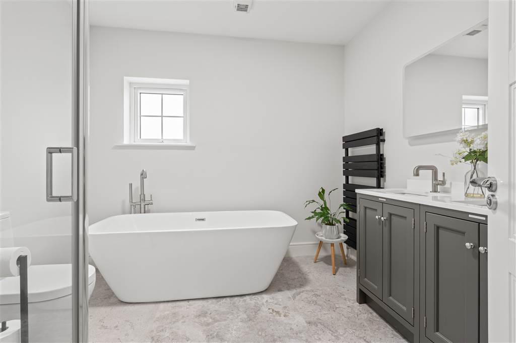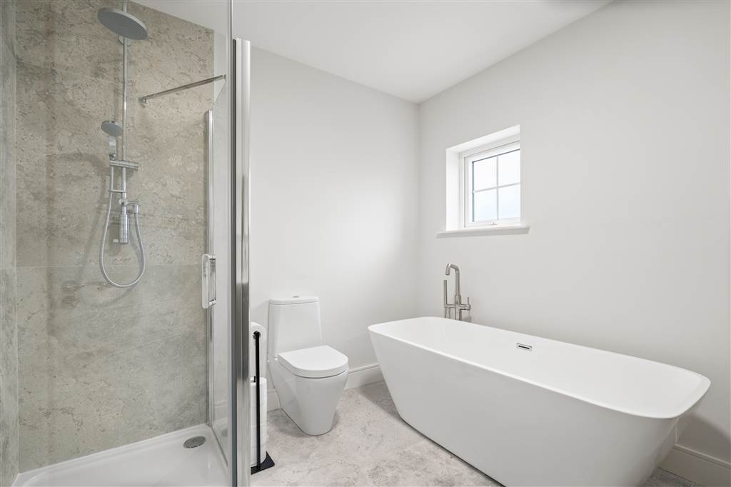 With 4-piece white suite comprising LFWC, WHB with double sink unit and built-in vanity unit, free-standing bath with hand-held shower head and shower to enclosed tiled cubicle. Heated towel rail. Tiled flooring.