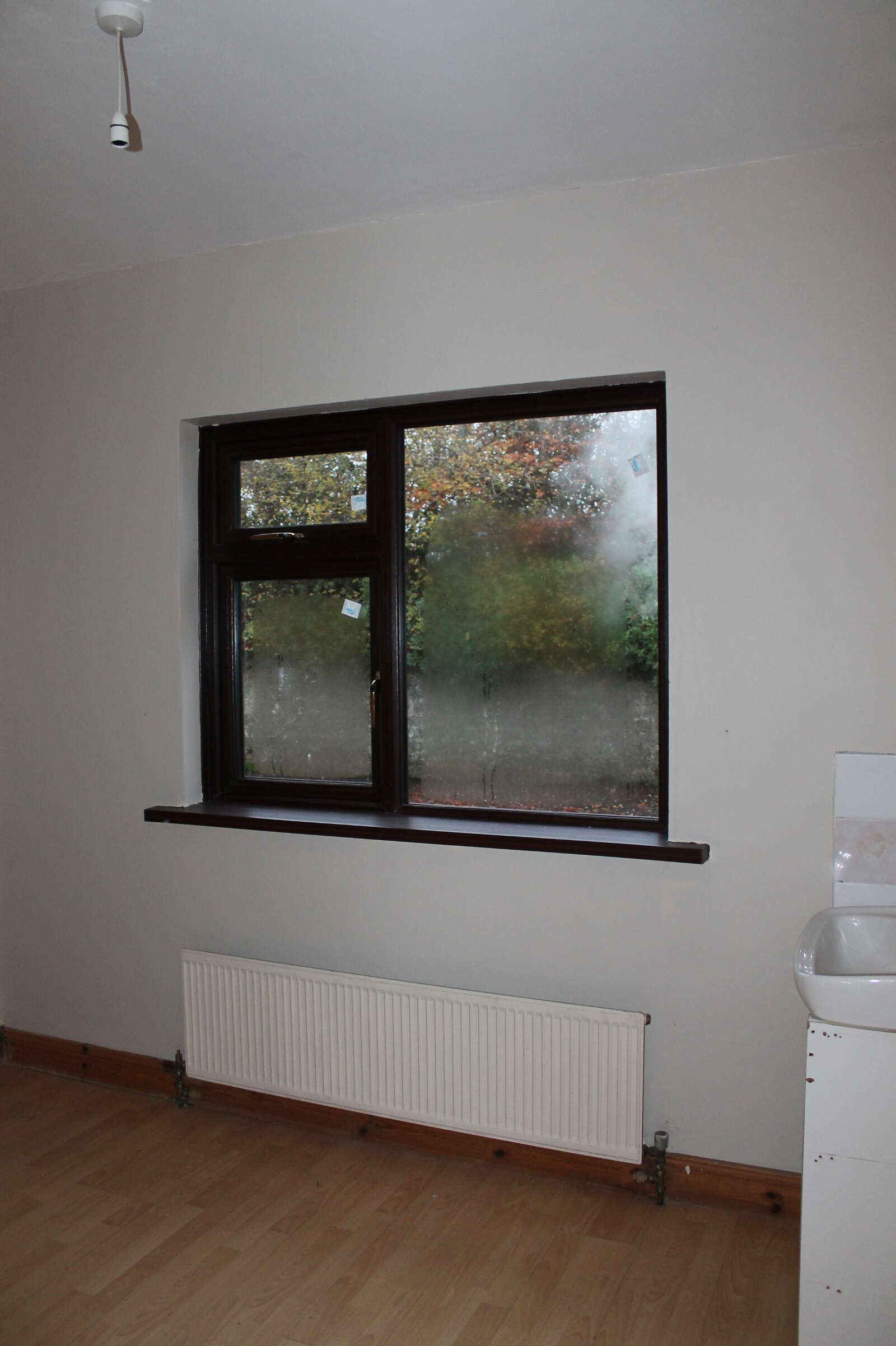 To the left is a spacious sitting room with a feature window designed to capture the lovely views into Co Leitrim. Open fire with stone surround, wooden floor covering, French doors leading to an extensive kitchen / dining room measuring 21.2 x 11.4 - Stanley Oil fired cooker, range of units, stainless steel sink, plumbed for a dish washer.