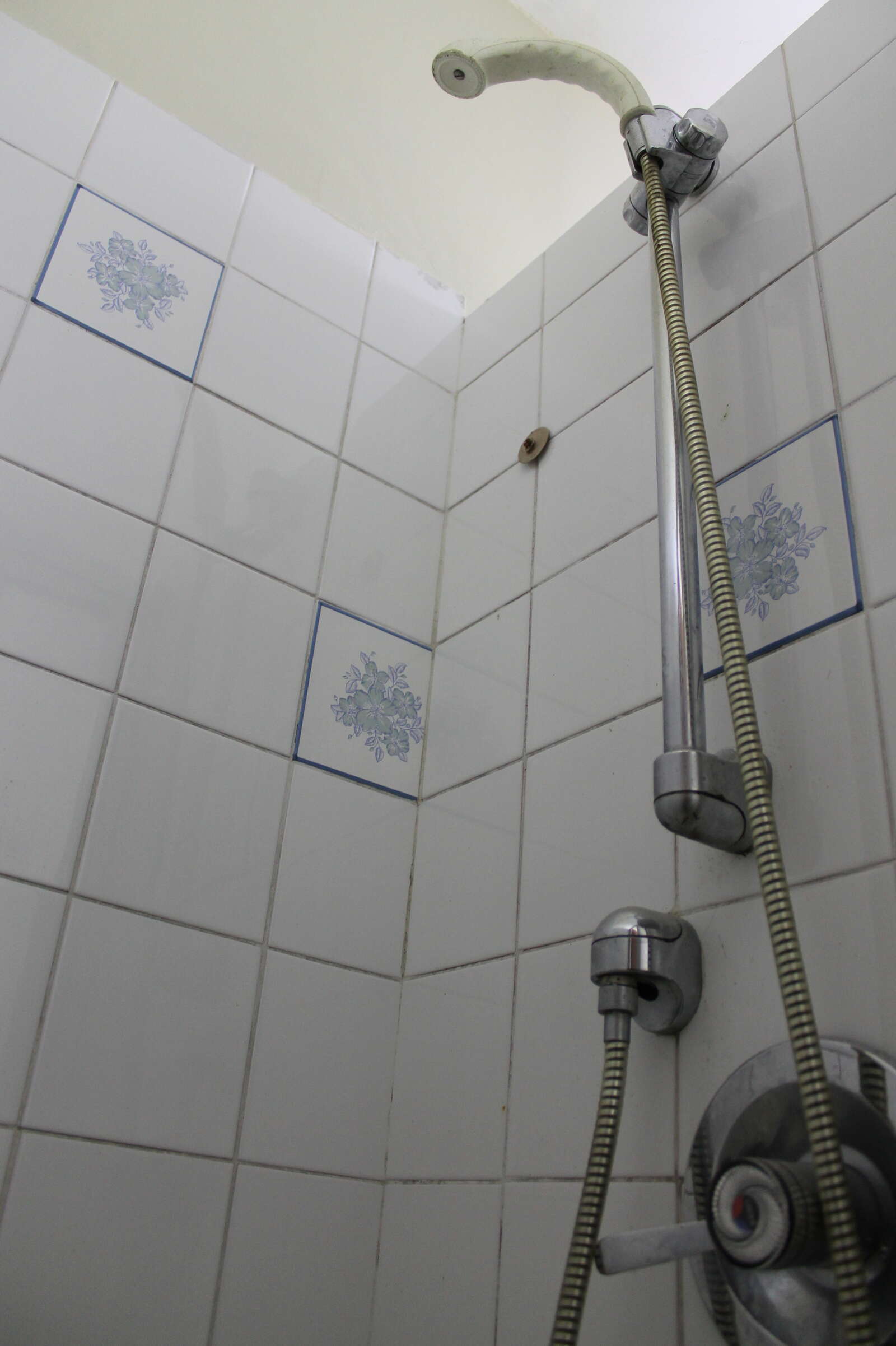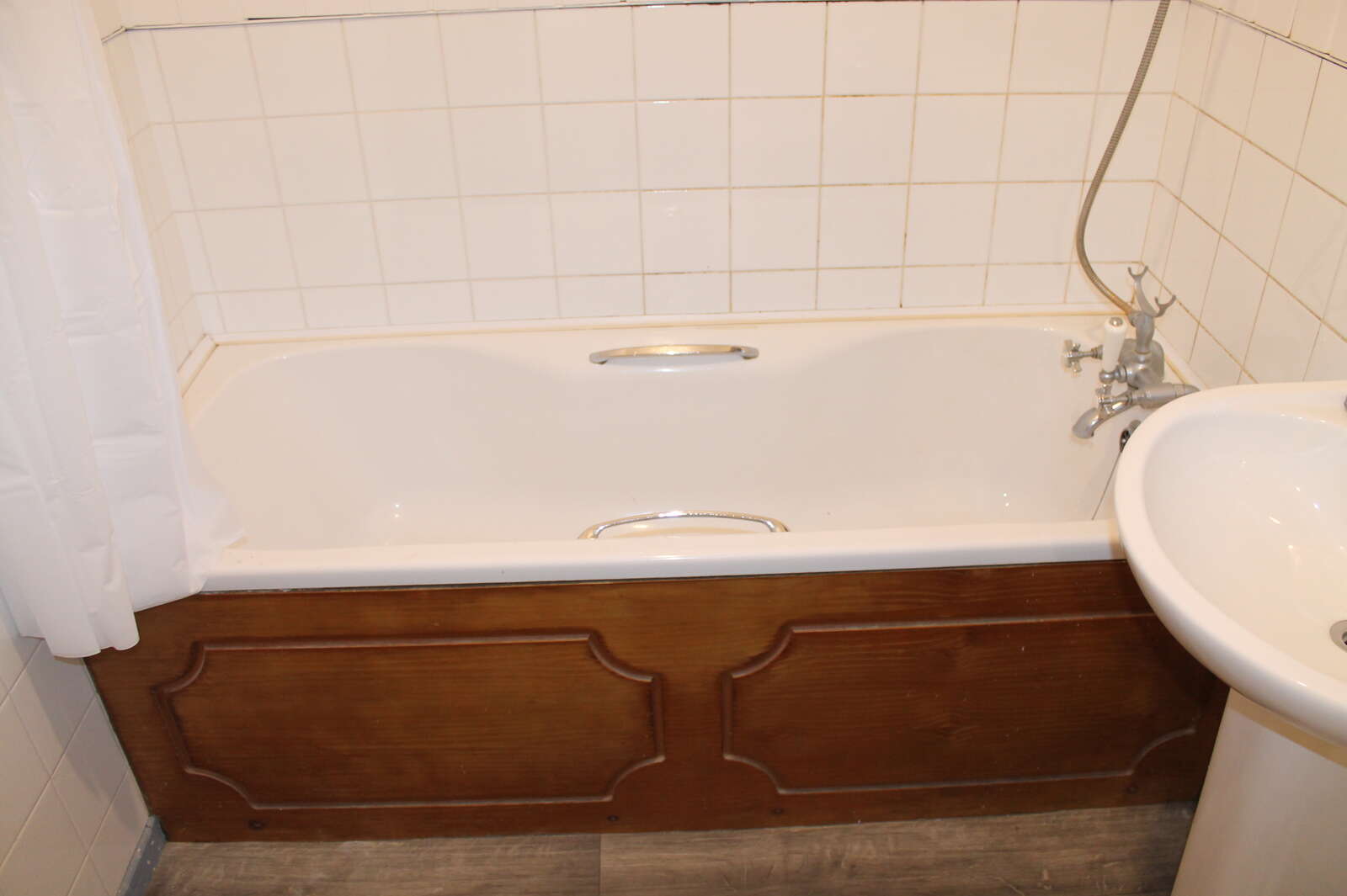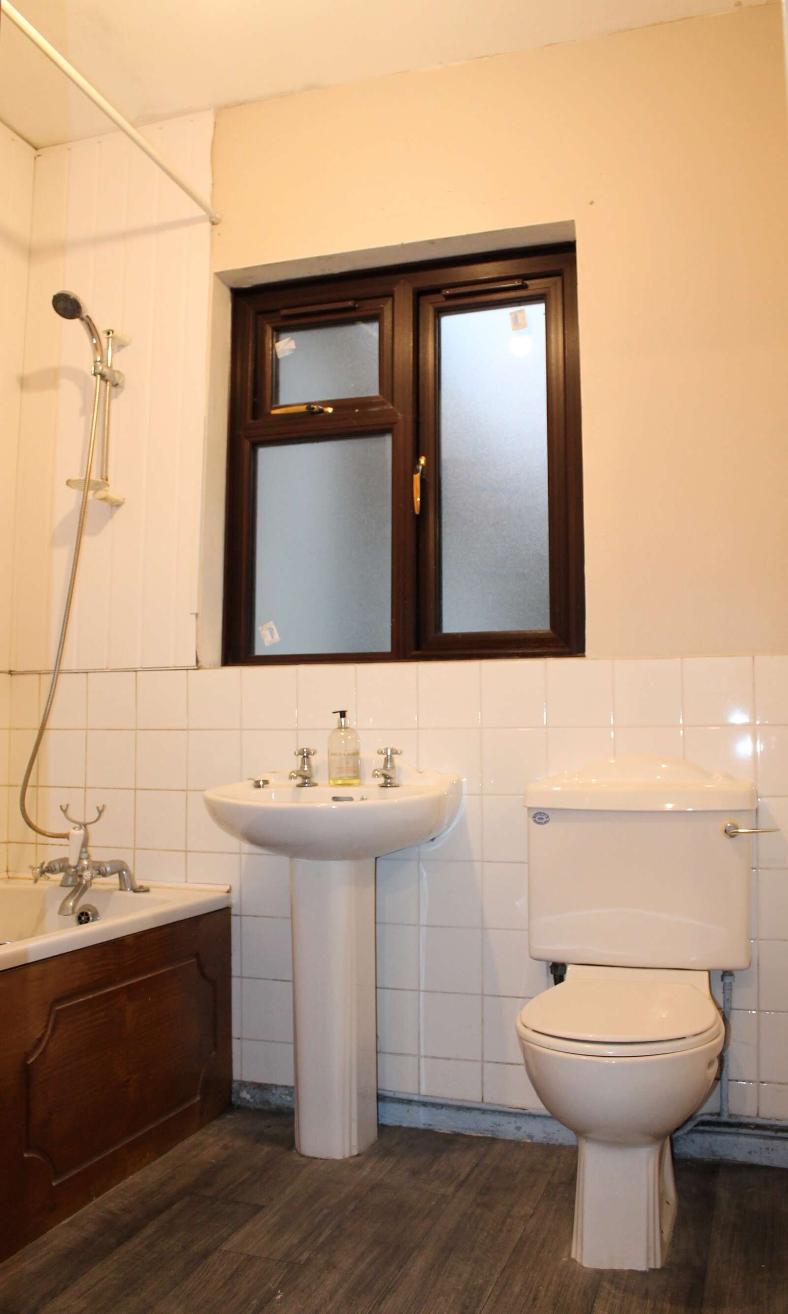 Bathroom: 7.1 x 5.6. Shower over bath, WC & WHB, wooden floor covering.