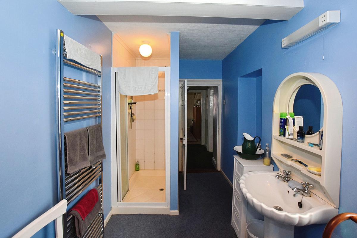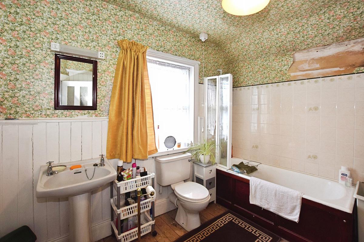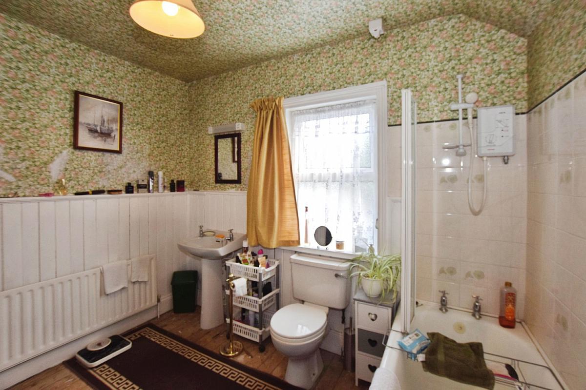 With WC, pedestal wash hand basin, shower over bath, half panelled walls, shaver point with light, wooden floor and hot-press.