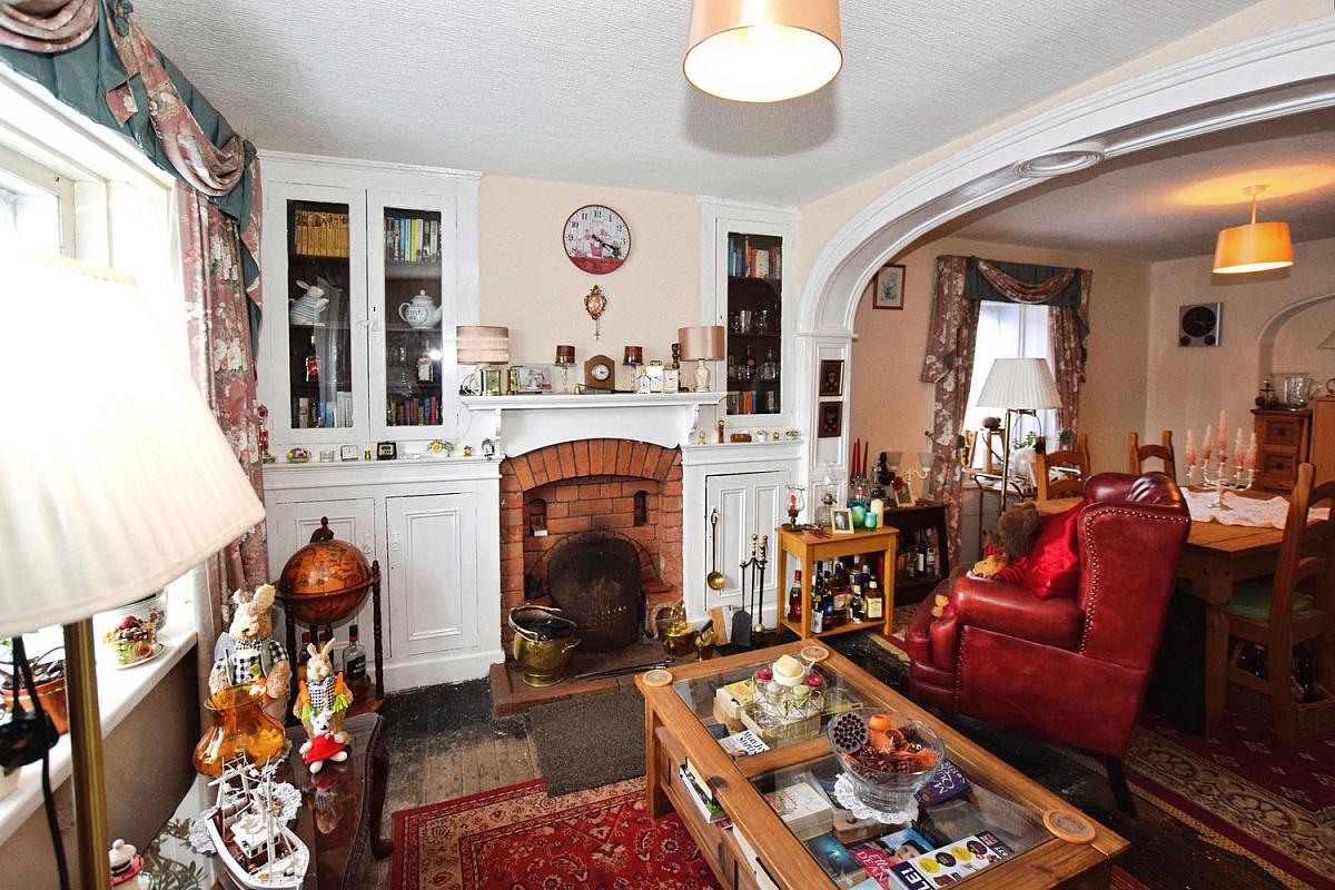 Total measurement (Widest Points) With feature archway, rustic brick fireplace and integrated display cabinets.