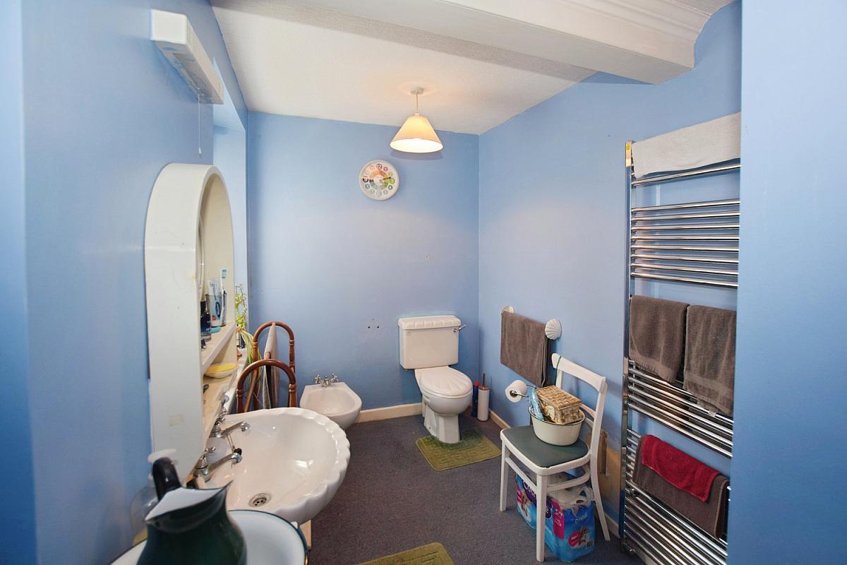 With WC, pedestal wash hand basin, bidet, fully tiled walk-in shower cubicle, chrome heated towel rail and shaver point with light.