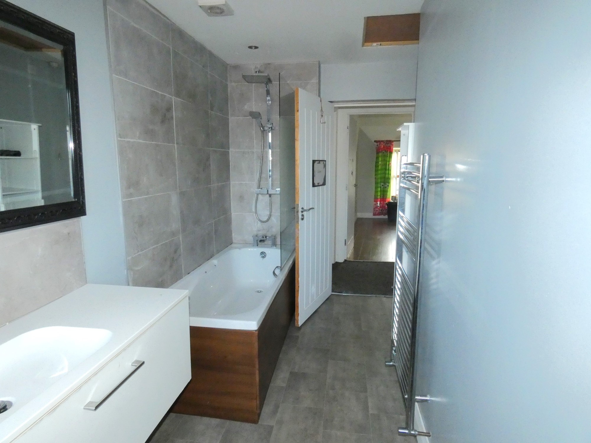 With fitted suite including bath with shower unit above bath, shower screen, tiled around bath and shower unit, w.c, wash hand basin with storage drawer and tiled splashback, heated towel rail, extractor fan, access to roofspace.