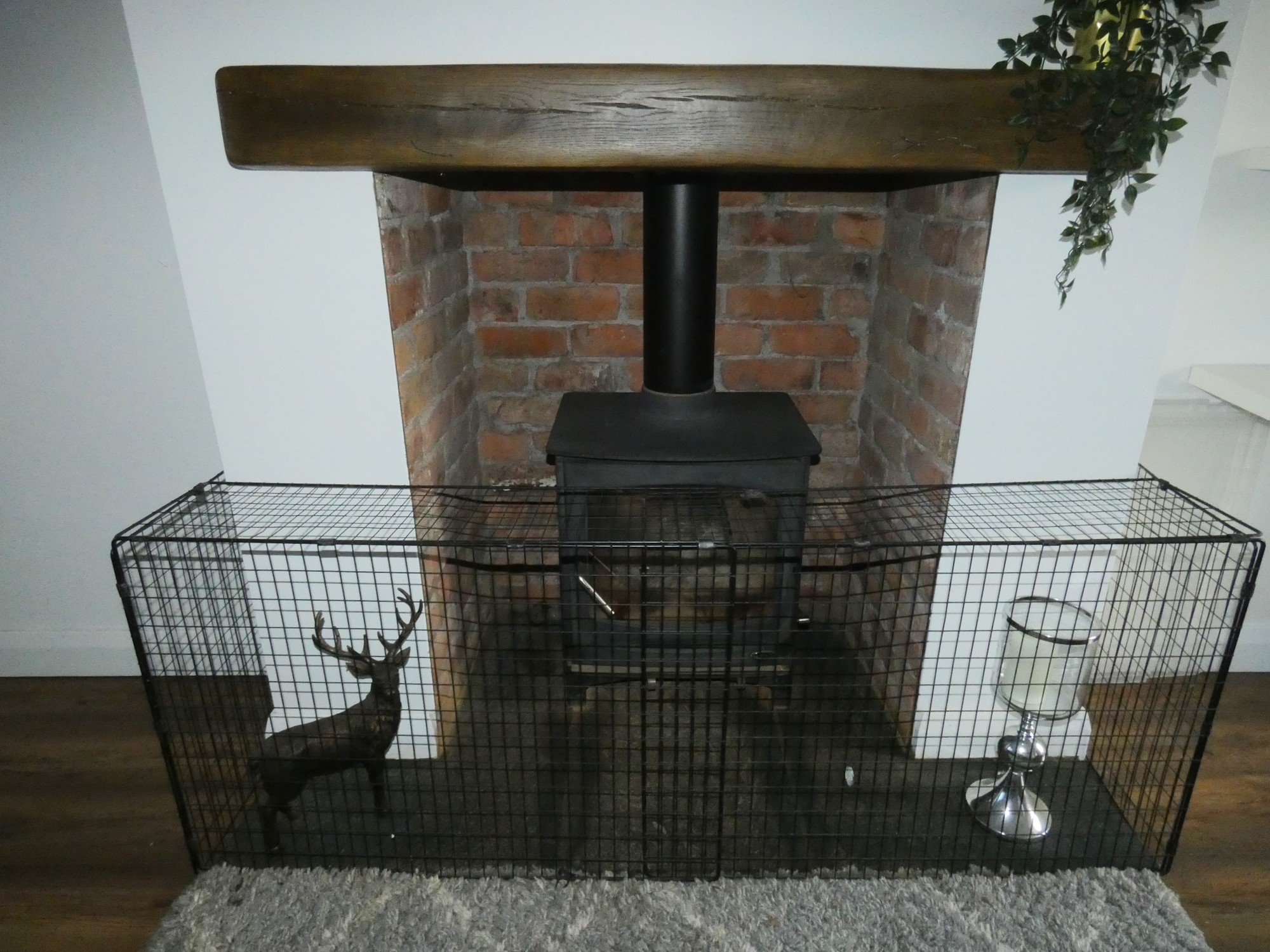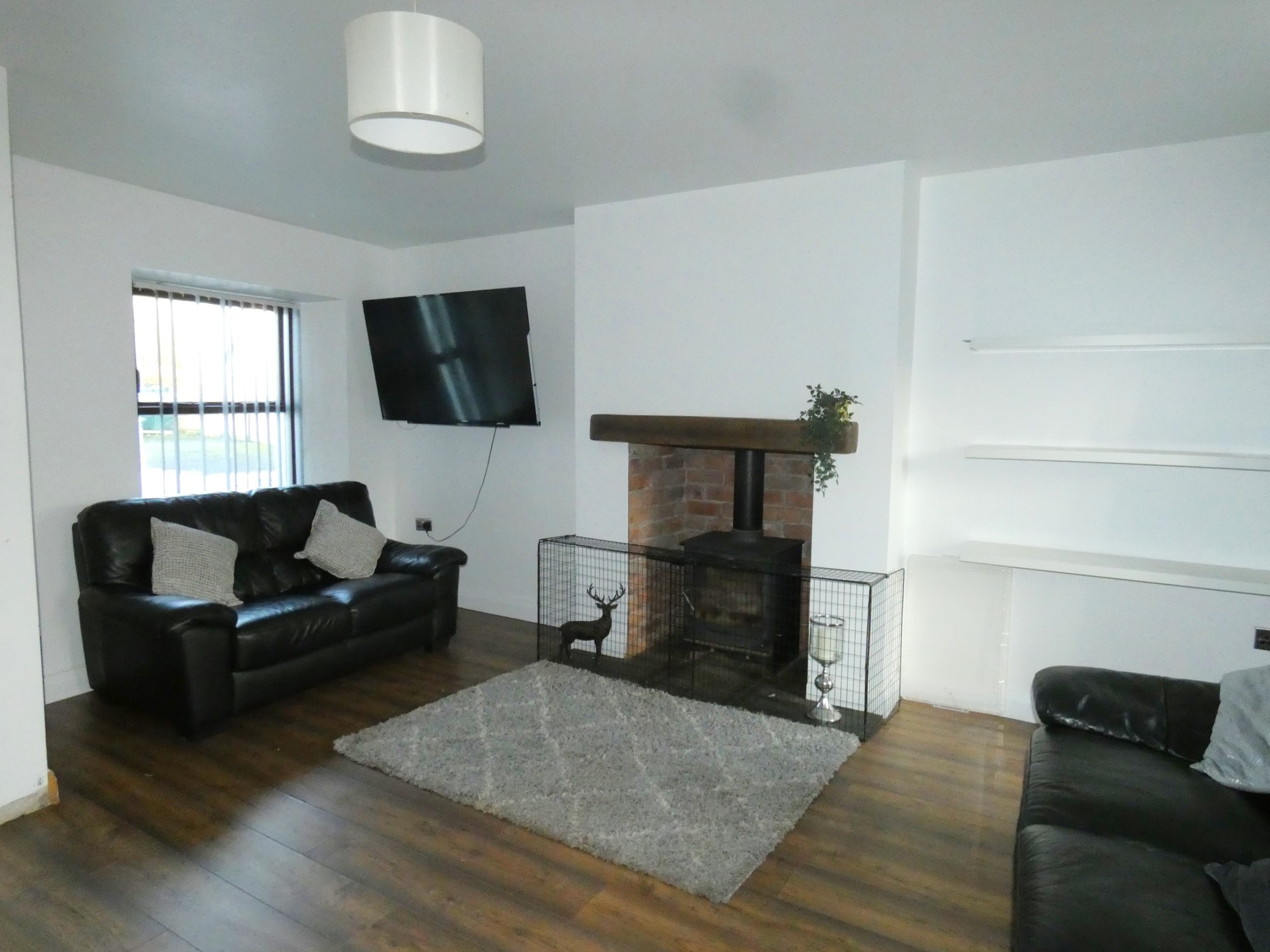 Attractive fireplace with brick inset, slate hearth, multi fuel stove, wooden mantle, wood laminate flooring, T.V. point, open storage space.