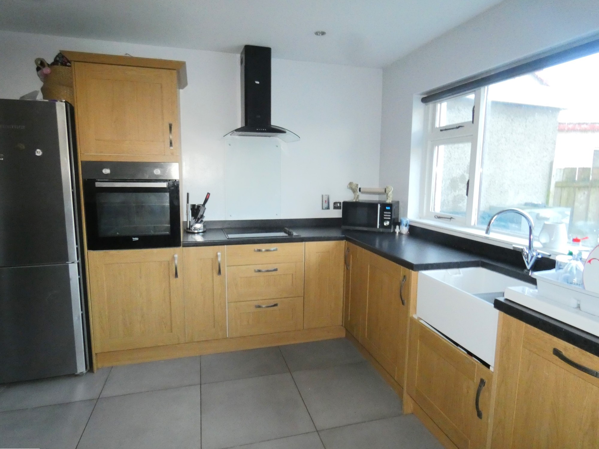 With a range of attractive eye and low level units including Hotpoint electric ceramic hob, extractor fan, Beko electric oven, Belfast type sink unit with mixer tap, integrated dishwasher, plumbed for an automatic washing machine, space for a tumble dryer, wine rack, ceiling downlights, tiled floor.