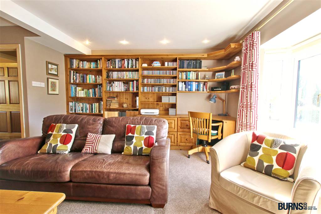 carpet; multi-fuel stove with black granite hearth; TV point; fibre broadband connection; built-in desk with shelving and cupboards; bay window; recessed spotlighting; radiator cover.