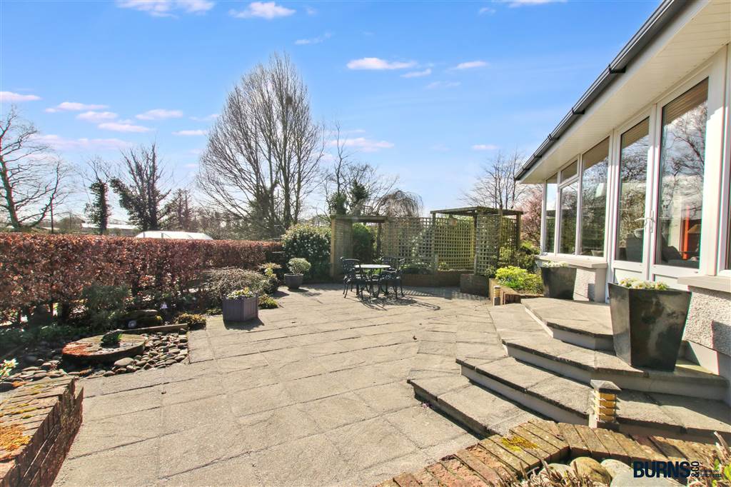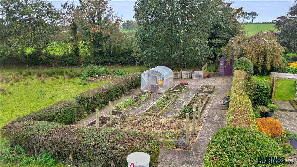 entrance pillars: tarmac driveway and parking area to front/side; asphalt parking area to rear; side gravel driveway to access stable black via stone pillars;; range of outbuildings including double garage/stable block, additional stores and wooden shed; summer house with water pond and patio area; vegetable garden with polytunnel and raised flower beds; manicured front, side and rear lawns with mature shrubs, flower beds and trees; 11 No. outside taps.