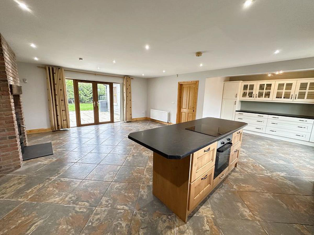 At the heart of the home is a stunning open-plan kitchen, dining, and living area, designed for modern family life and entertaining. The kitchen features a tasteful combination of oak and cream units, a central island, and a showpiece electric Aga, creating a warm and welcoming atmosphere. The adjoining living area is centred around a multi-fuel stove and opens directly onto a patio area, ideal for enjoying the tranquil outdoor setting.