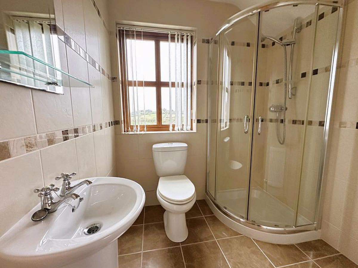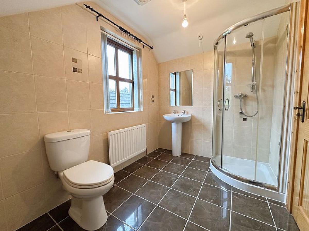 White suite comprising low flush WC, pedestal wash hand basin and quadrant shower cubicle with thermostatic mixer shower, fully tiled walls and floor, recessed ceiling spots, 1 radiator.