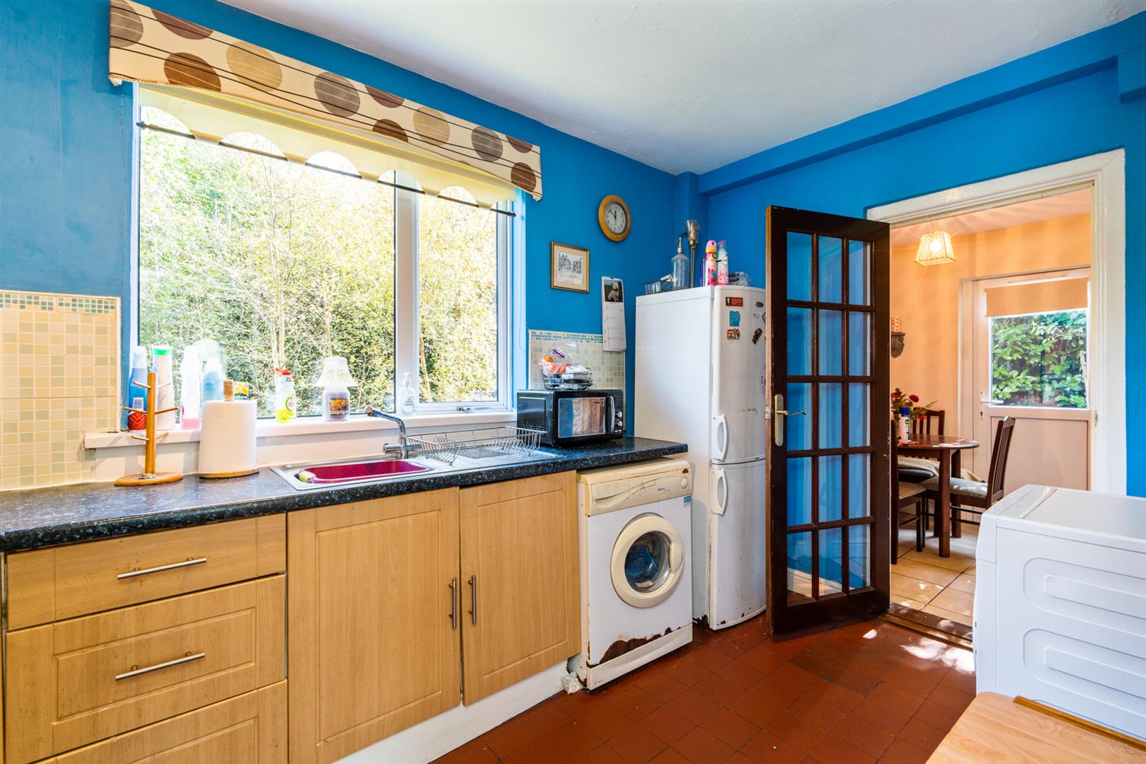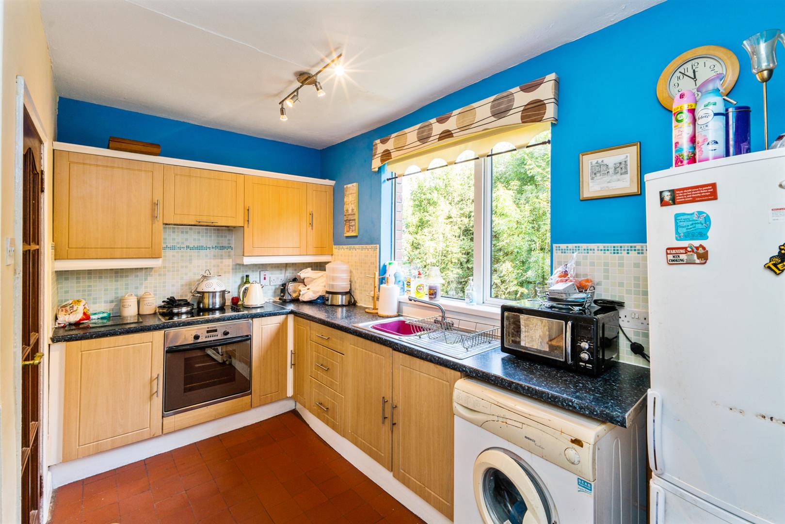 Range of high and low level units, granite effect work surfaces, inset single drainer stainless steel sink unit with mixer tap, built in oven, ceramic hob, integrated extractor hood, plumbed for washing machine, space for fridge freezer, part tiled walls, tiled flooring.