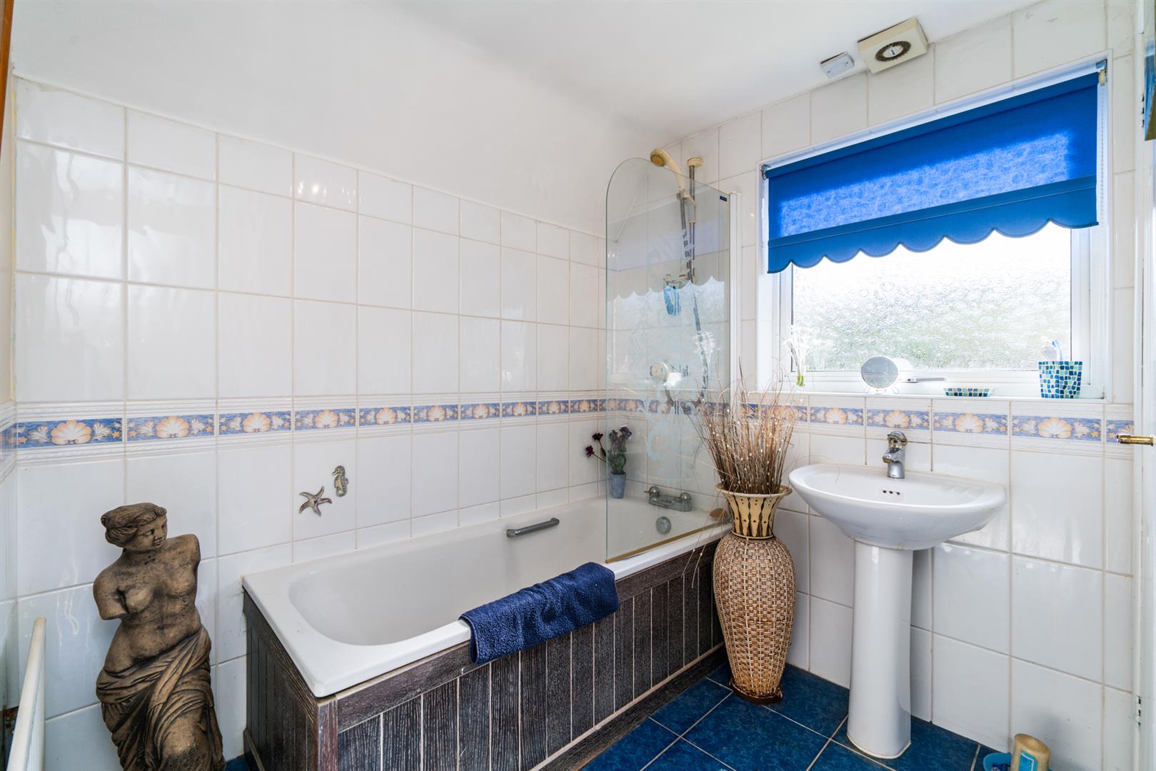 White suite comprising panelled bath with mixer tap, built in shower, shower screen, pedestal wash hand basin with mixer tap, ceramic tiled flooring, part tiled walls, hot press.