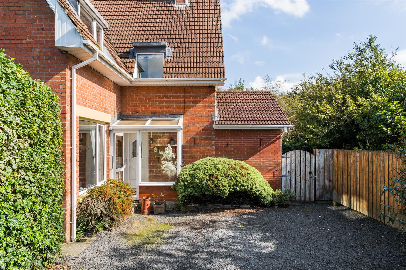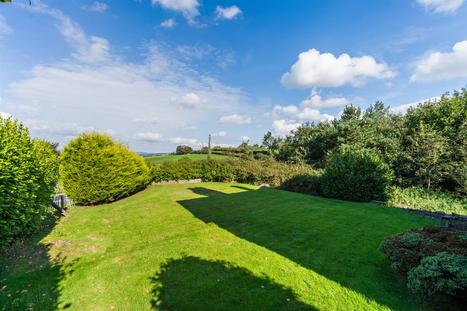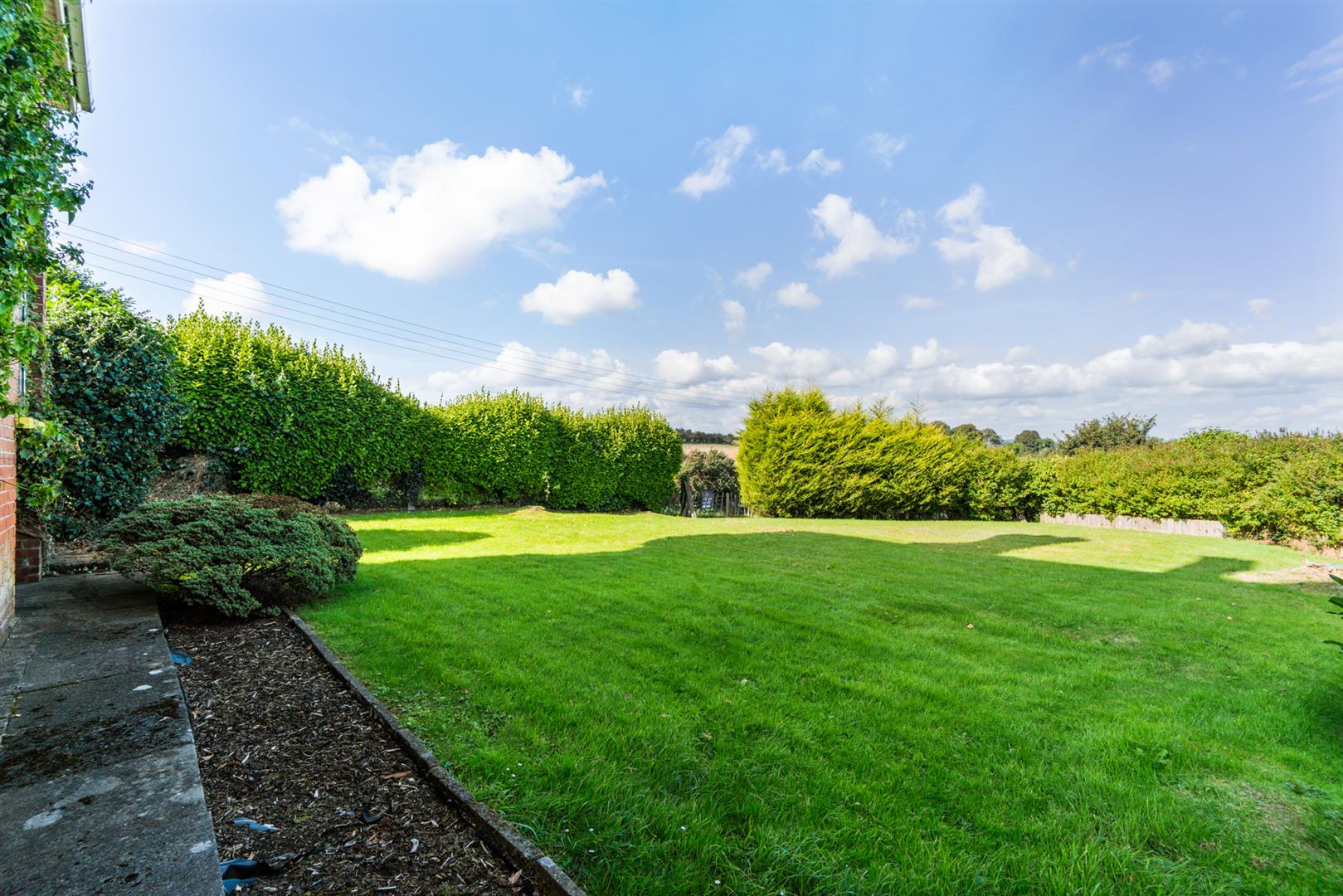 Front garden with lawn, flowerbeds and boundary hedge. Rear garden with trees and tarmac driveway.