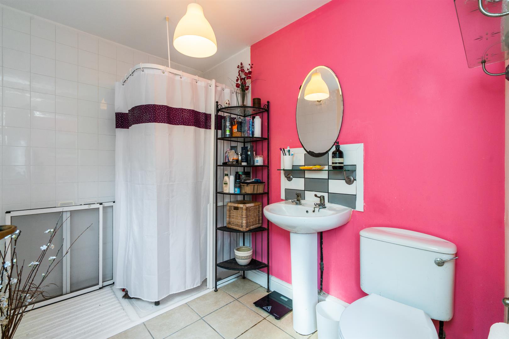White suite comprising walk in shower cubicle with electric shower and part tiled walls, pedestal wash hand basin, tiled splash back, low flush WC, ceramic tiled flooring.