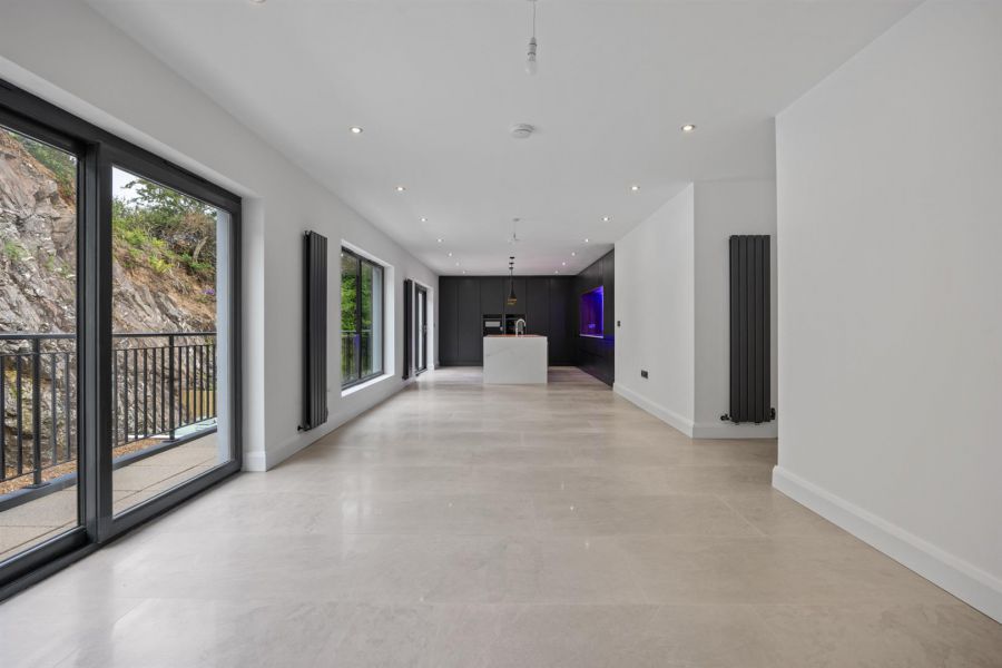 New luxury floor to ceiling range of units including Quartz worktops with 'Neff' ceramic hob, Quartz upstand, full width mirror and integrated extractor. Built-in 'Neff' oven and microwave oven with heating drawer. Integrated full length fridge and full length freezer. Built-in coffee bar station, cupboard with illuminated glass shelving and Quartz worktop. Large feature island with waterfall Quartz worktop including single drainer and inset 'Franke' double stainless steel sink unit and Quooker tap. Integrated dishwasher, integrated pull-out bins, built-in wine fridge, drop down feature lights over island, wall mounted radiators, porcelain tiled flooring, recessed spotlighting. Second large sliding patio doors to balcony. Open to dining area.