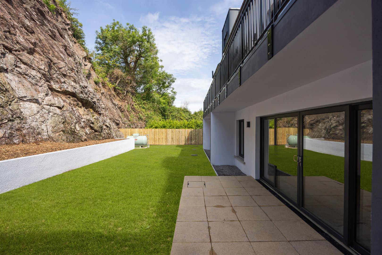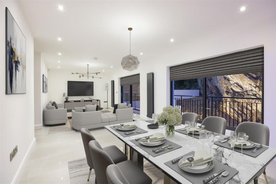 The ground floor comprises generous entrance foyer with solid Oak wood staircase as feature backdrop, double doors to superb lounge with views, open plan living to rear with two sets of sliding patio doors to balcony, enjoying superb views over lower deck garden area, and stunning illuminated cliff face. Dining area leading to luxury kitchen, fitted floor to ceiling bespoke handleless units, integrated 'Neff' appliances, and waterfall feature Quartz worktop island. The ground floor also includes one of the five bedrooms with luxury en-suite shower room, and separate cloak room with toilet suite.