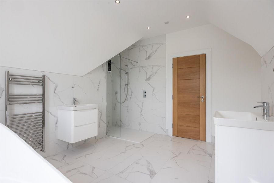 Luxury new white suite comprising large walk-in shower area with built-in rainfall shower and handheld shower, tiled walls, shower screen, vanity unit with mixer tap, tiled splashback, low flush WC, chrome feature radiator, porcelain tiled flooring with skirting, recessed spotlighting, extractor fan.