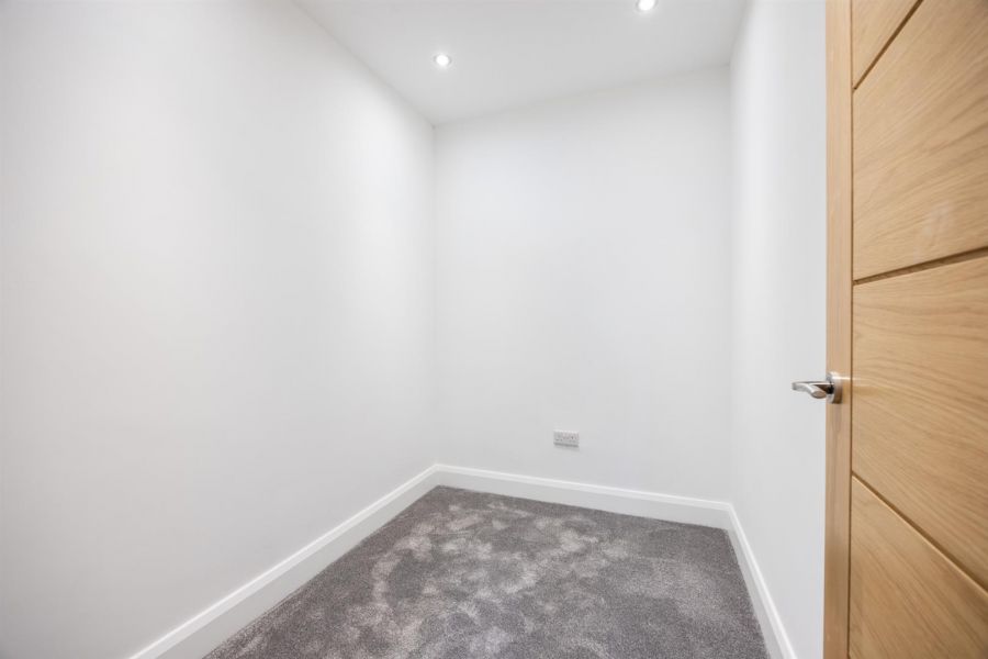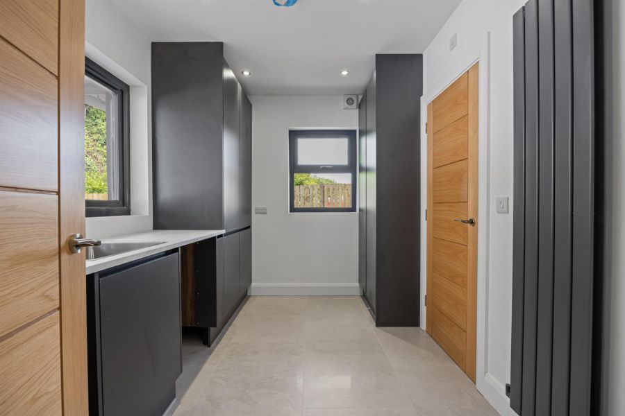 Luxury new range of high and low level units, Quartz effect work surfaces, inset stainless steel sink unit with mixer tap, cupboard with 2 x gas fired boiler, plumbed for washing machine, space for dryer, porcelain tiled flooring, wall mounted radiator, recessed spotlighting, extractor fan, walk-in comms room.