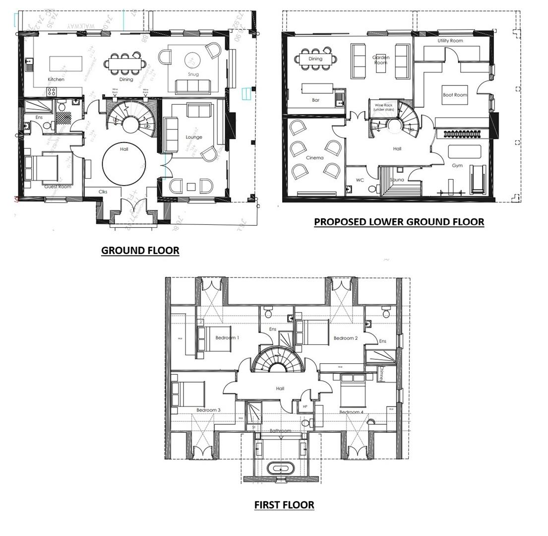 The first floor comprises four double bedrooms, with principal bedroom and bedroom two, both including dressing areas and luxury en-suite shower rooms with wet areas. Luxury family bathroom with freestanding feature bath, built-in shower area, and his and her vanity units, all finished in a beautiful porcelain tile. The lower ground floor enjoys it's own separate entrance at the side, and also benefits from the feature staircase leading down from the main entrance hall to what would be a superb self-contained apartment, or alternatively, a games room with bar area, cinema room, gym with sauna, including a separate utility which can easily transform into a kitchen.