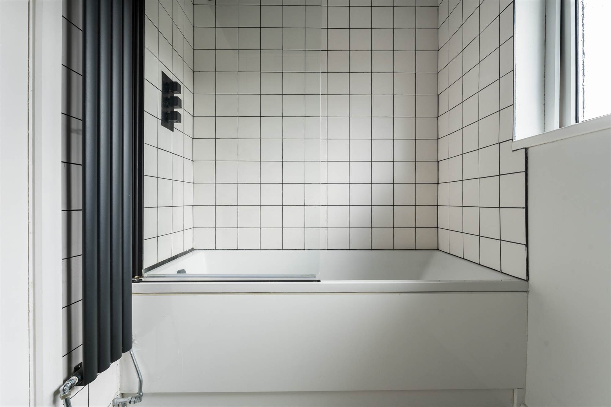 White suite comprising panelled bath with shower over and shower screen. Wash hand basin with mixer tap and storage underneath. WC with Roca flush controls. Part tiled walls, feature radiator.