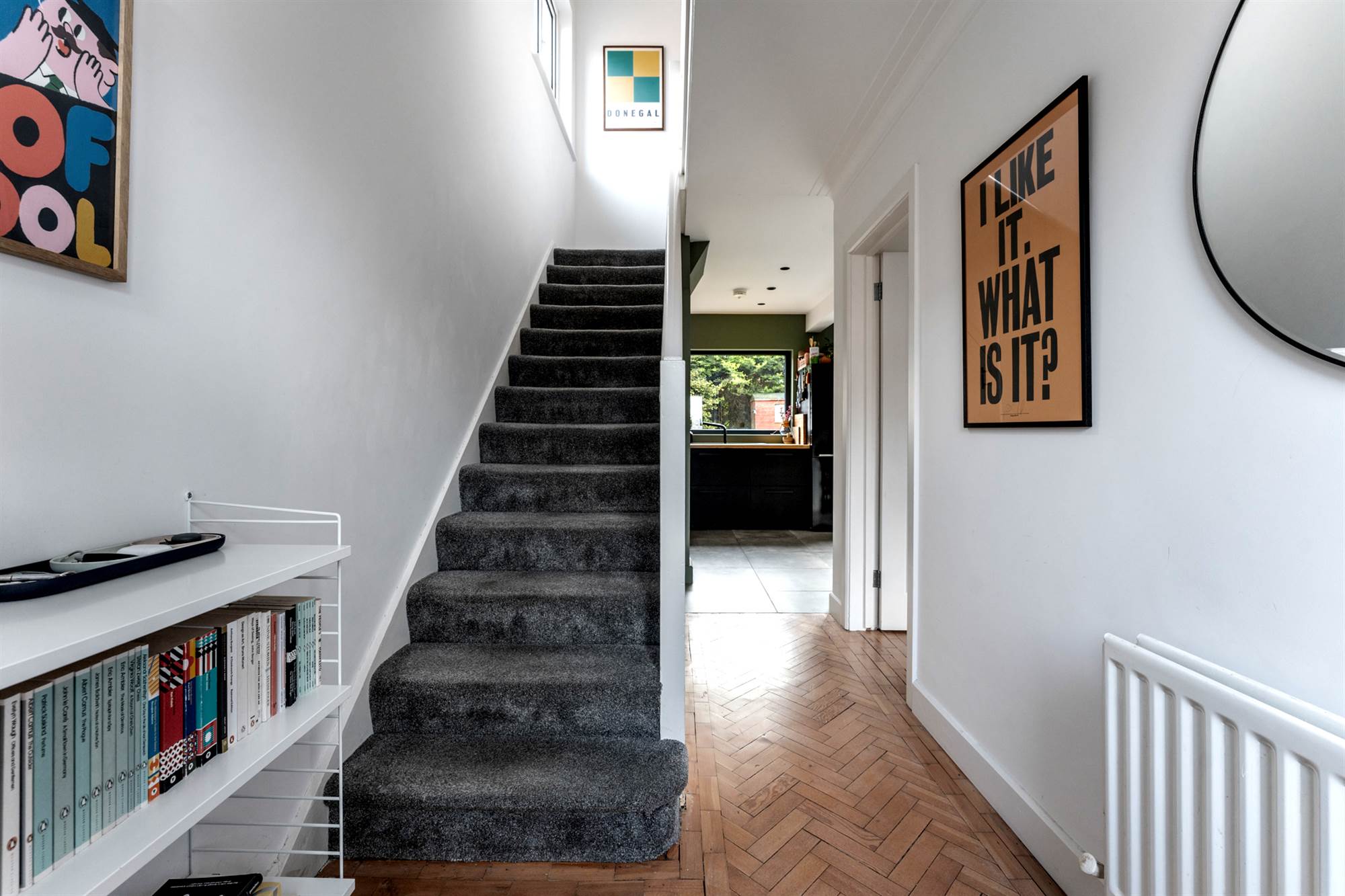 Parquet herringbone wood-block flooring. Cornice ceiling. Understairs storage cupboard.
