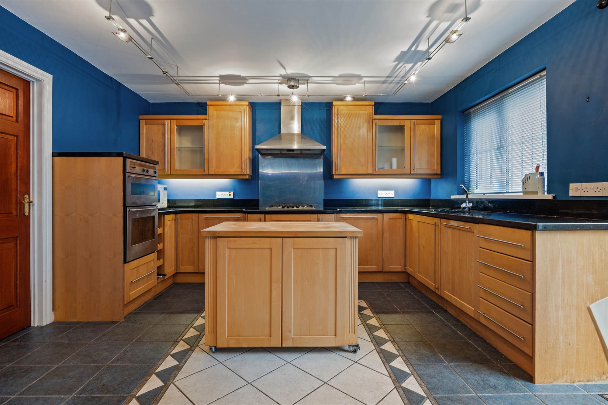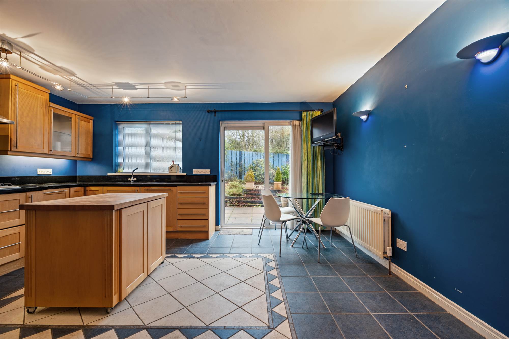 Range of high and low level cupboards with glass display cabinets and granite work surfaces. Additional, moveable island unit. Franke underhung one and a half bowl stainless steel sink unit. Integrated appliances including Bosch double oven. Four ring gas hob with extractor fan over. Integrated Bosch dishwasher. Fridge. Casual dining area with sliding patio door to garden.