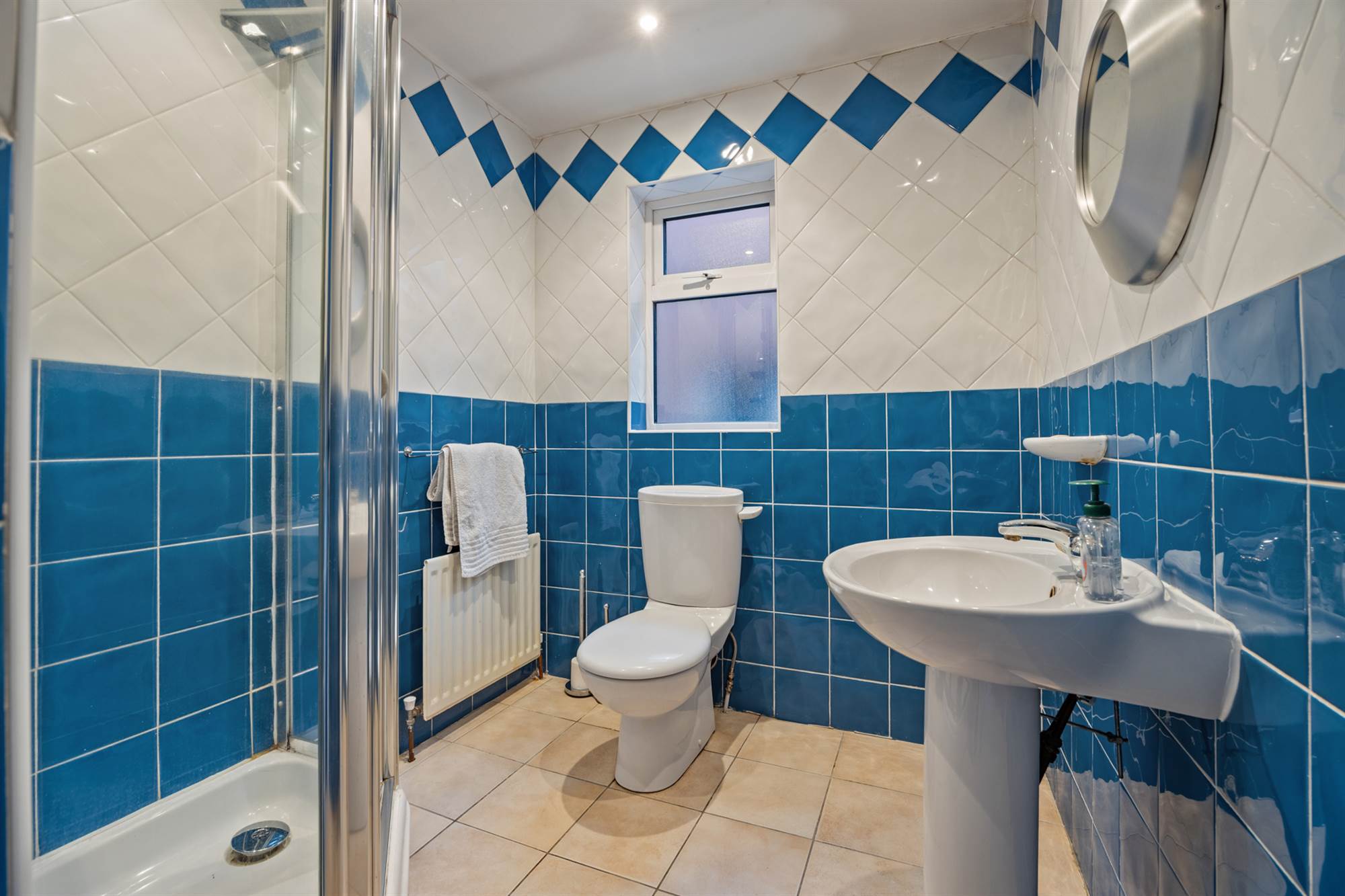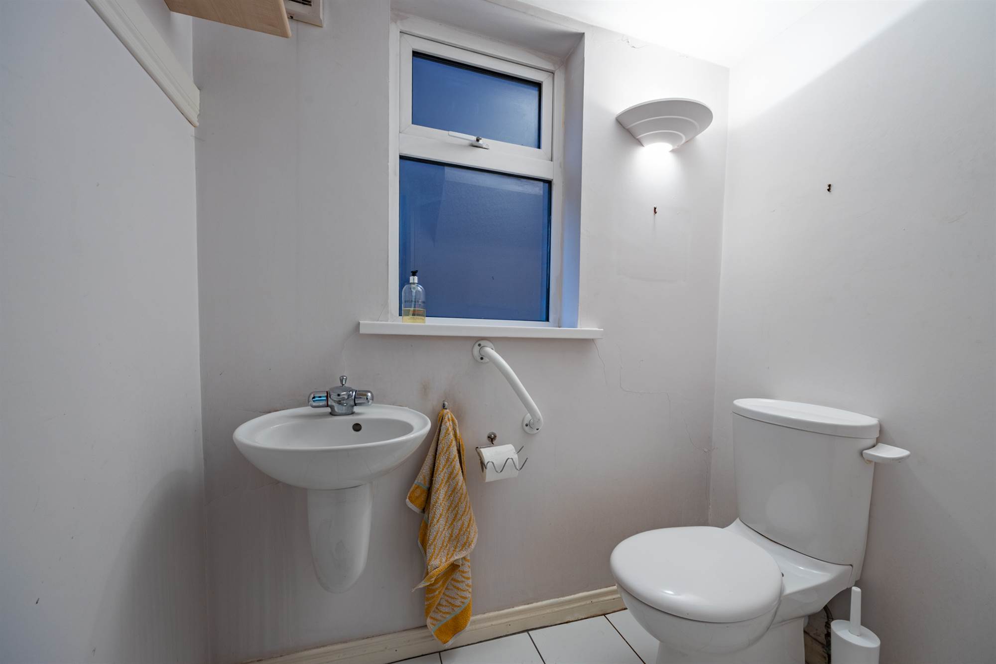 Low flush, wash hand basin. Ceramic tiled floor. Cloaks area with shelf.