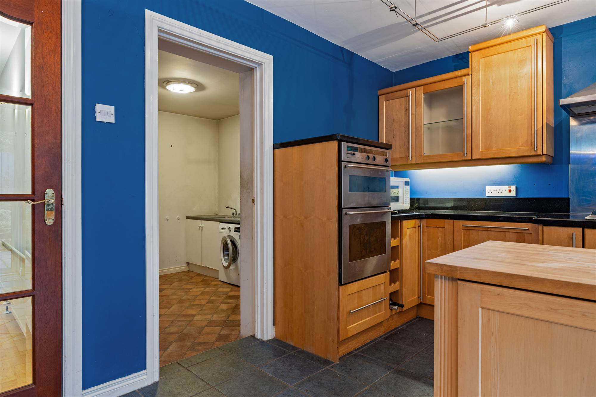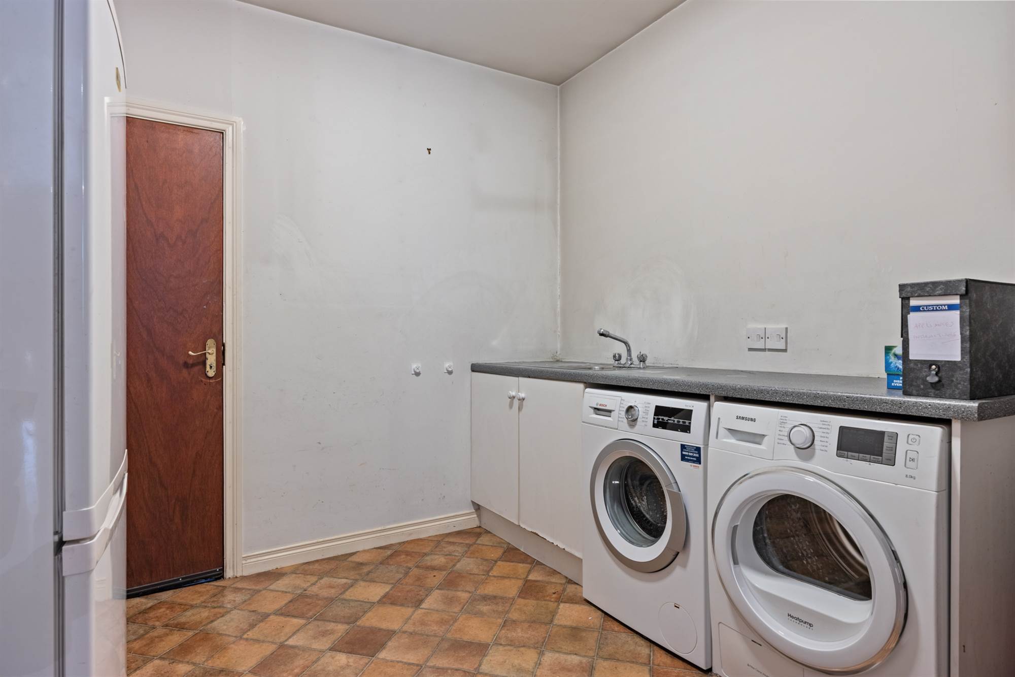 Plumbed for washing machine, space for tumble dryer, fridge, freezer etc. Oil fired boiler. Service door to garage. Single drainer stainless steel sink unit.