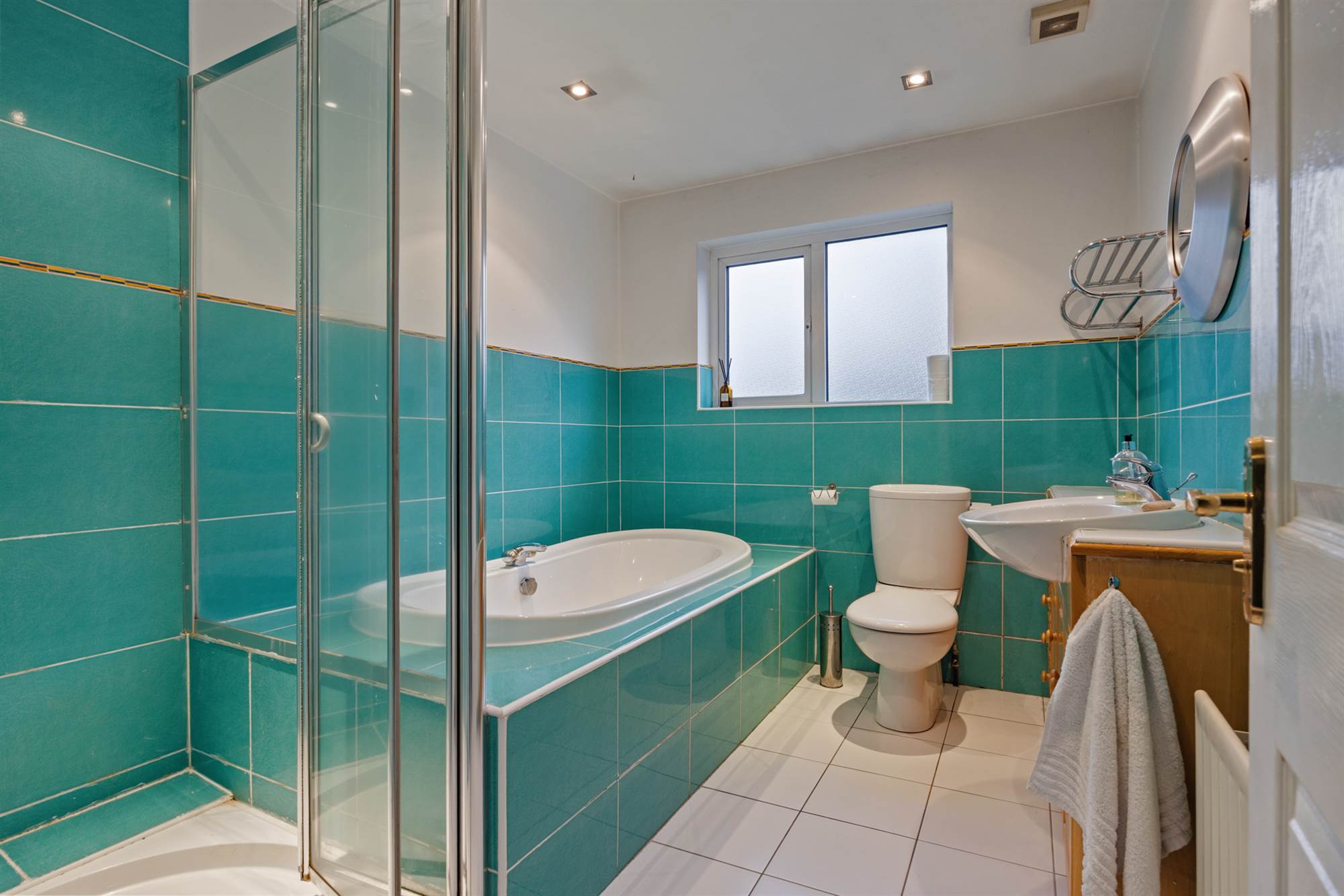 White suite comprising panelled bath. Separate corner shower cubicle. Wash hand basin, part tiled walls, ceramic tiled floor.