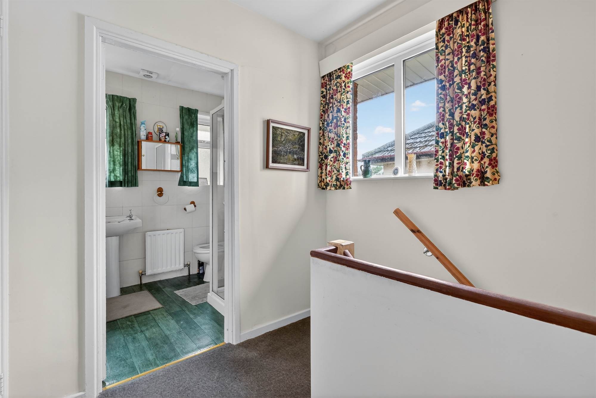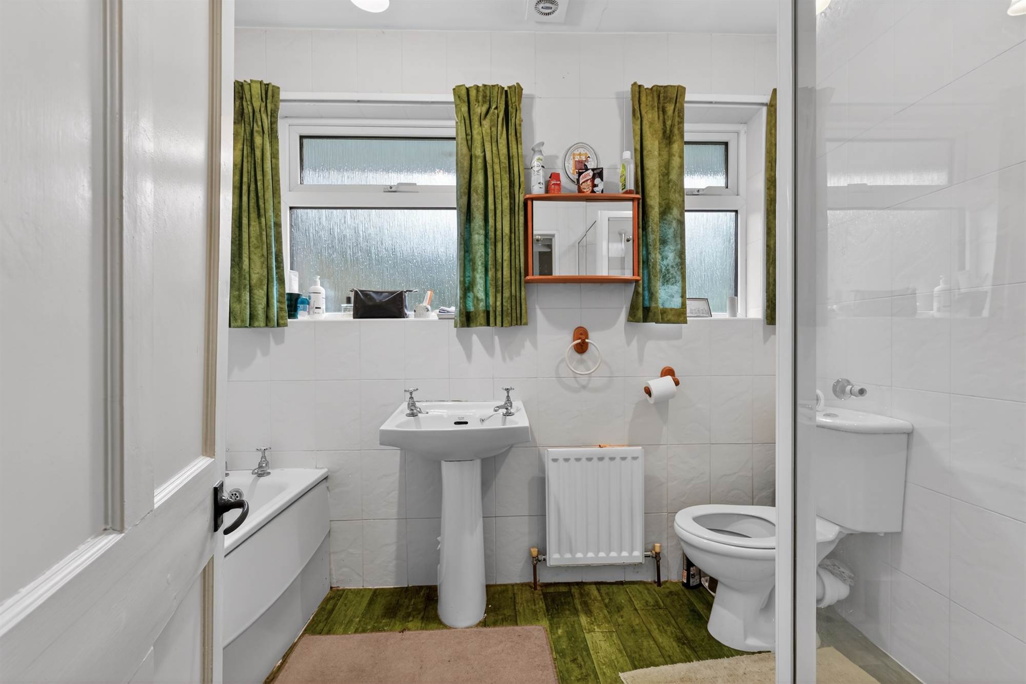 White suite comprising panelled bath, pedestal wash hand basin, low flush wc, built-in shower cubicle with Mira Sport electric shower.