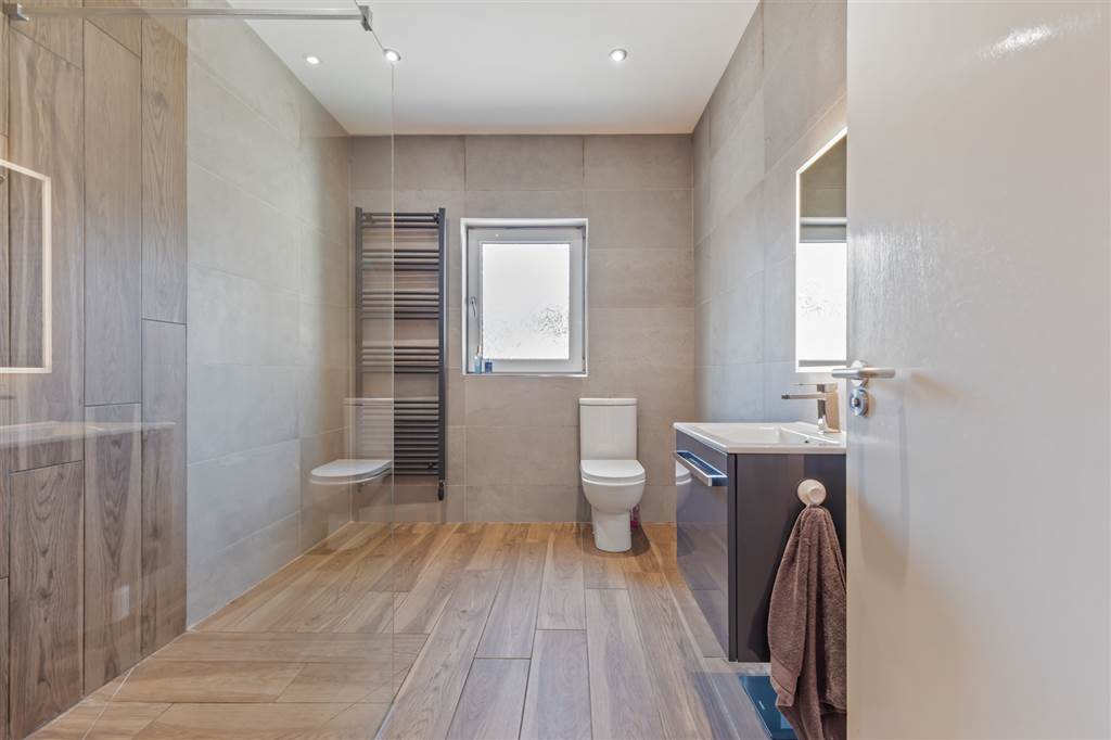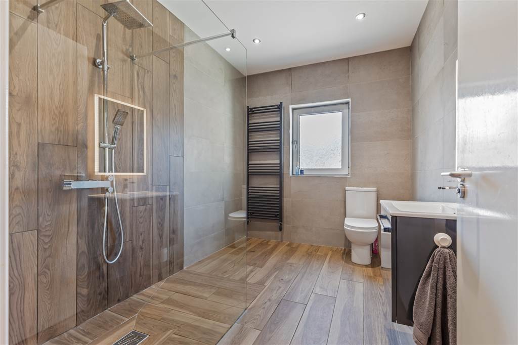 Fully adapted wet room for accessibility and comfort comprising thermostatic bar shower valve with square shower head and hand shower, vanity wash hand basin and low flush wc. Heated towel rail, recessed low voltage lighting, extractor fan, tiled walls and floor.