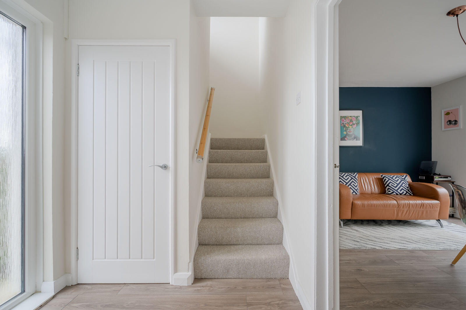 Laminate wooden floor, built-in under stairs storage cupboard.