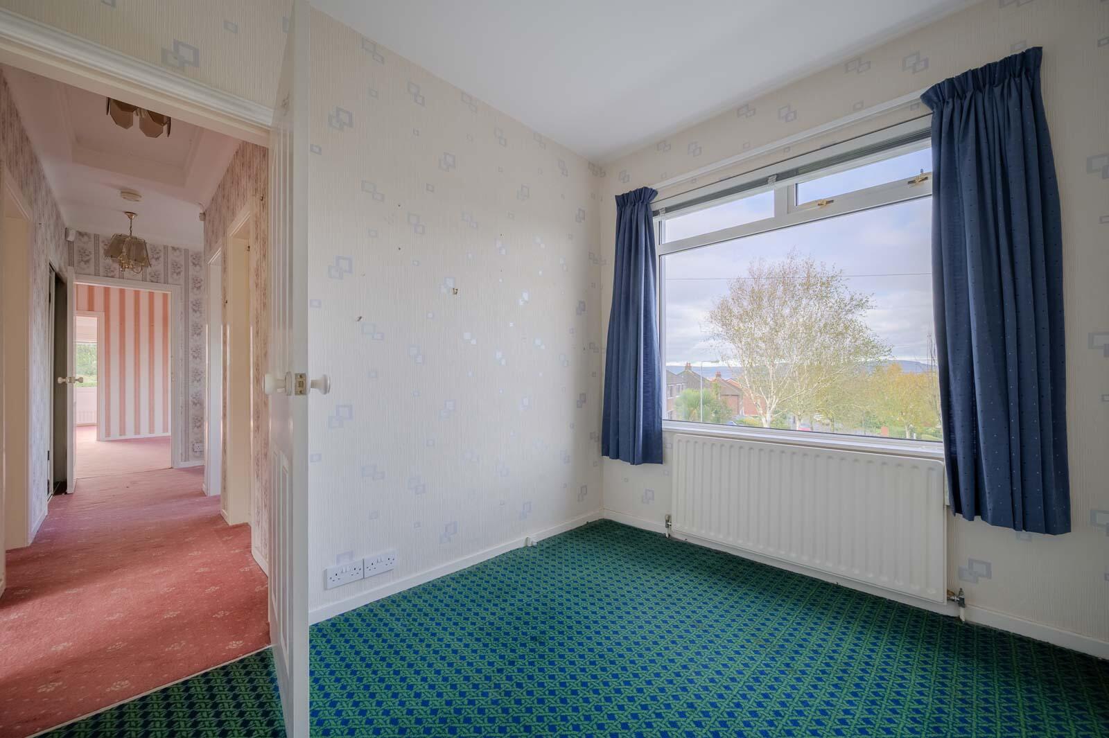 With outlook to front and views over Belfast, cornice ceiling, stone fireplace with built-in shelf and tiled hearth.