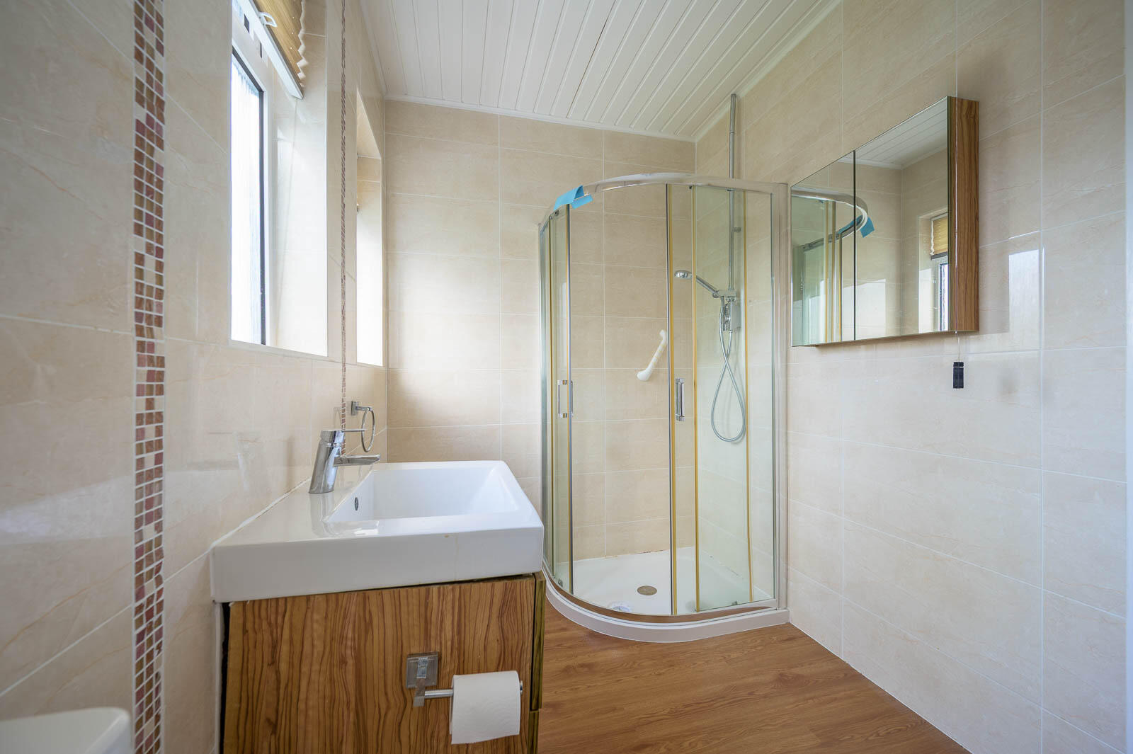 The fitted kitchen offers excellent storage and workspace, with direct access to the sunroom and rear patio. Three well-proportioned bedrooms and a modern family shower room complete the internal accommodation, providing comfortable and versatile living.