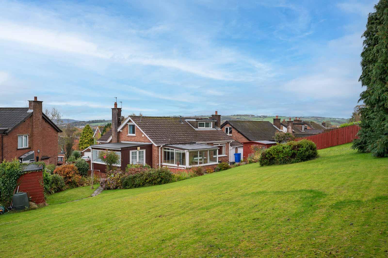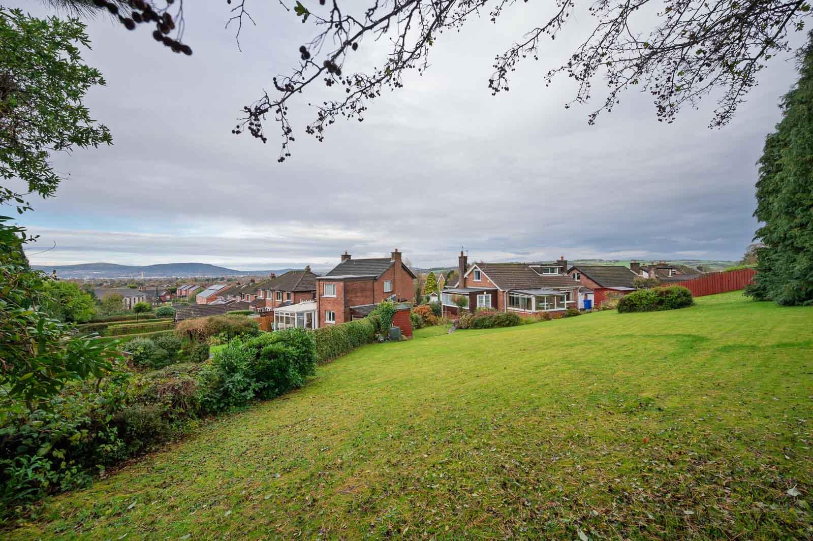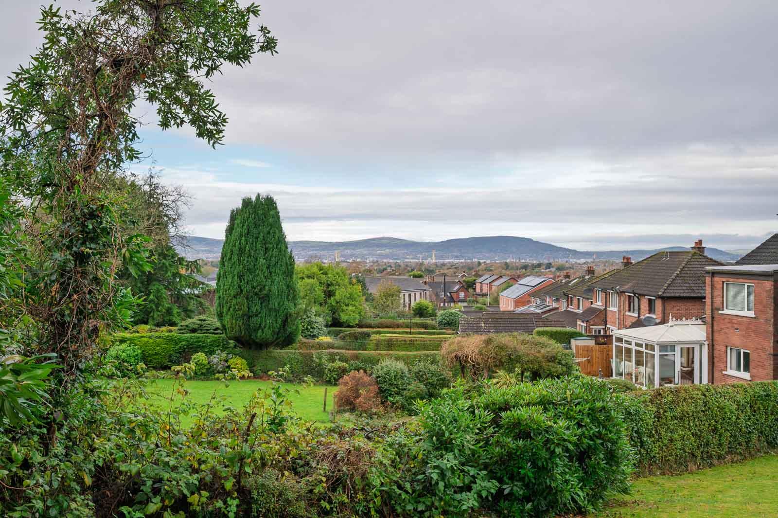 Tarmac driveway to front leading to attached garage, gardens to front in lawn with mature shrubs, excellent garden to rear in lawns with paved patio areas, mature shrubs, trees, bushes, plants, excellent views across Belfast and surrounding countryside.