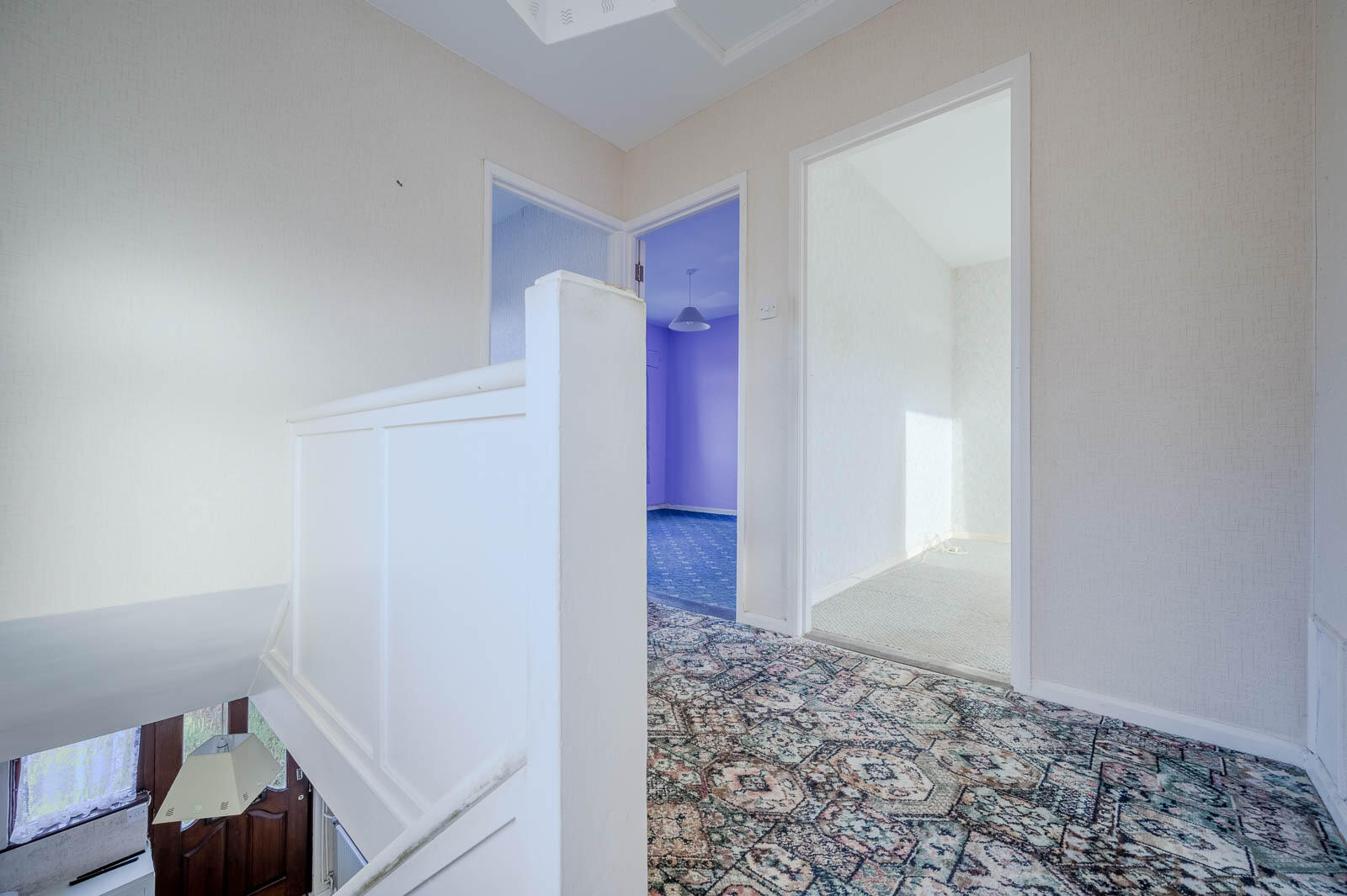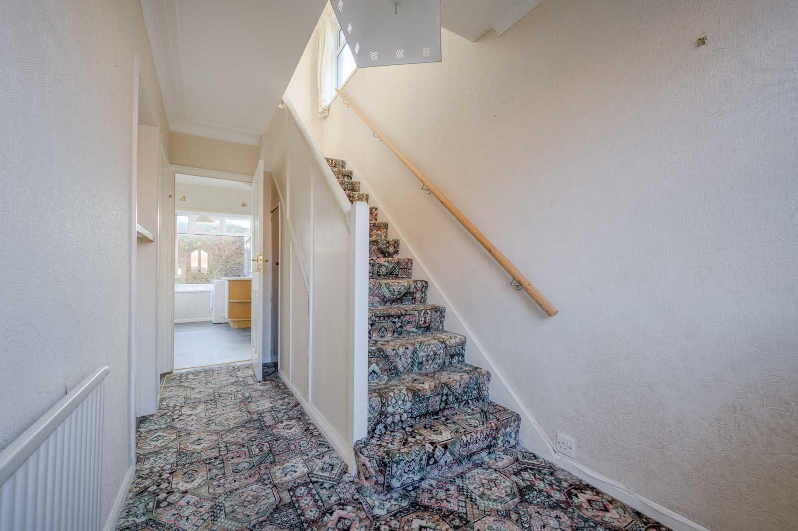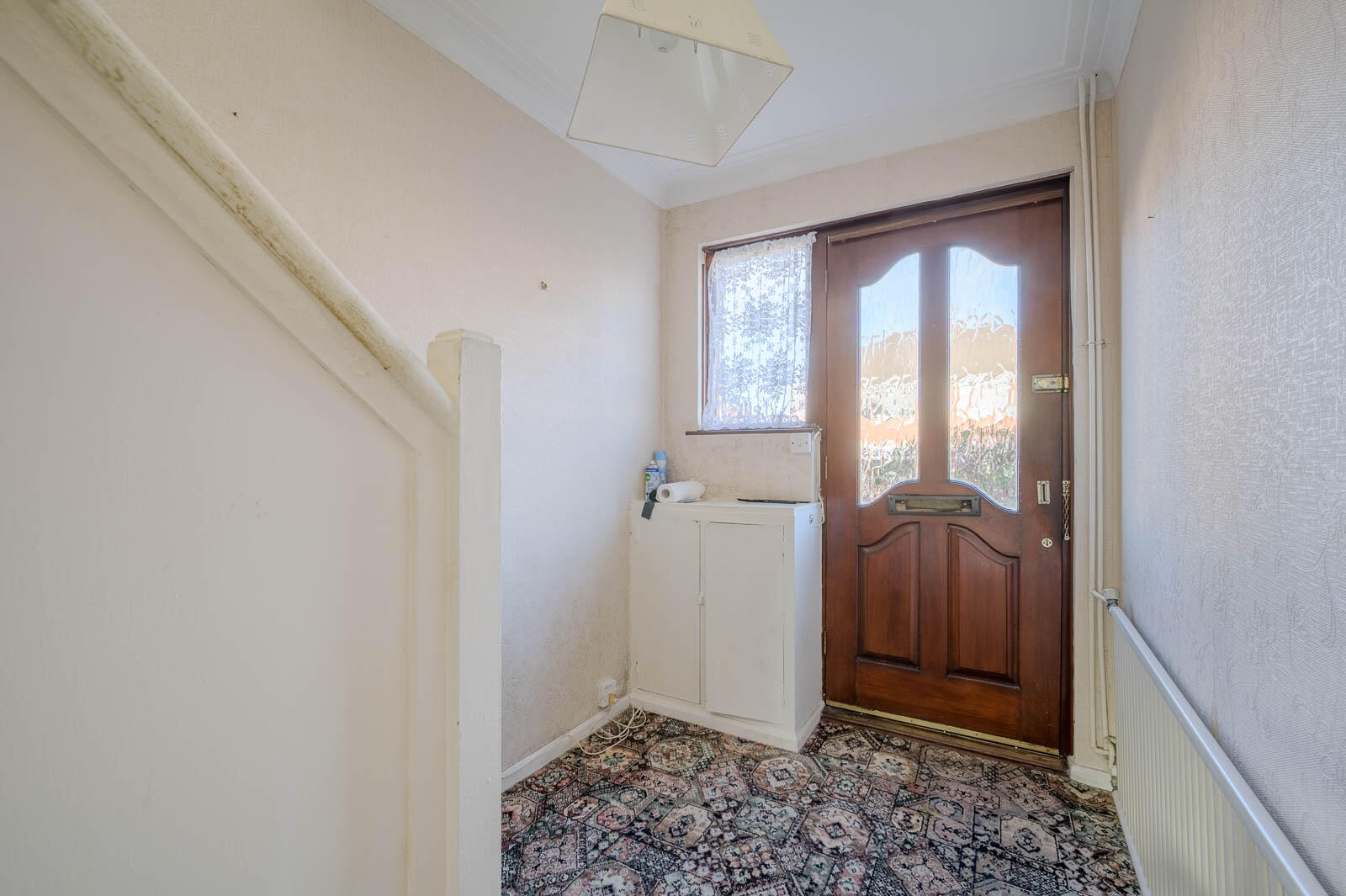 The ground floor comprises two bright reception rooms, including a front lounge with a large picture window and a second room that can serve as a dining area or additional living space. The kitchen is positioned at the rear of the property and provides direct access to the garden, offering scope for redesign and improvement.