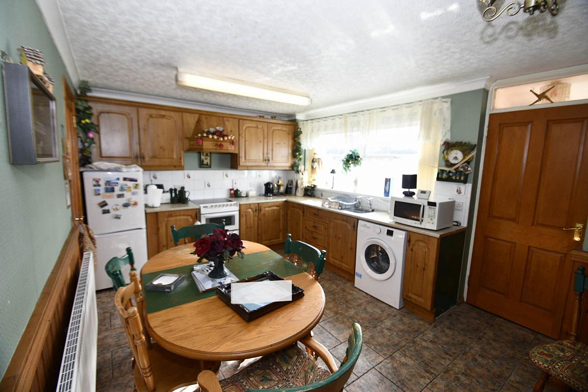 Fitted kitchen with a range of high and low level units, formica work surfaces, stainless steel sink drainer,space for freestanding cooker, space for washing machine, dining area part tiled walls, ceramic tiled flooring, wooden wall panelling, coven ceiling