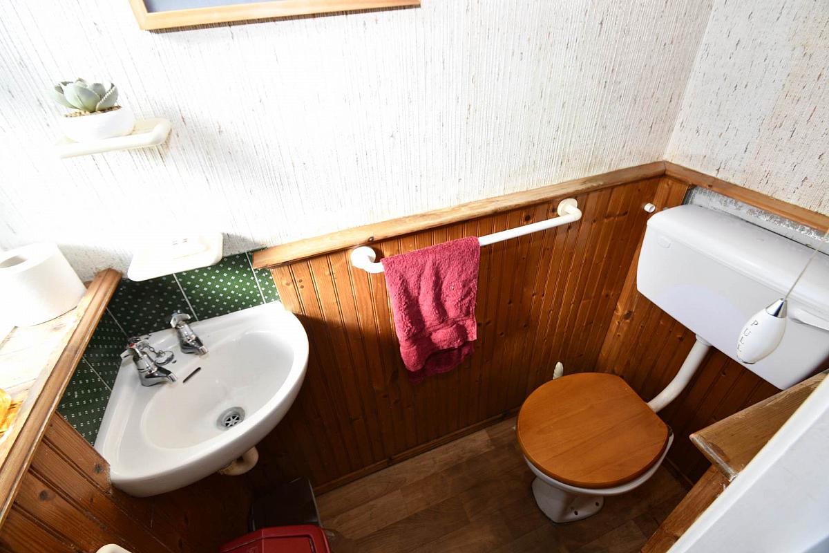 Wash hand basin, low flush WC, vinyl flooring, wooden wall panelling