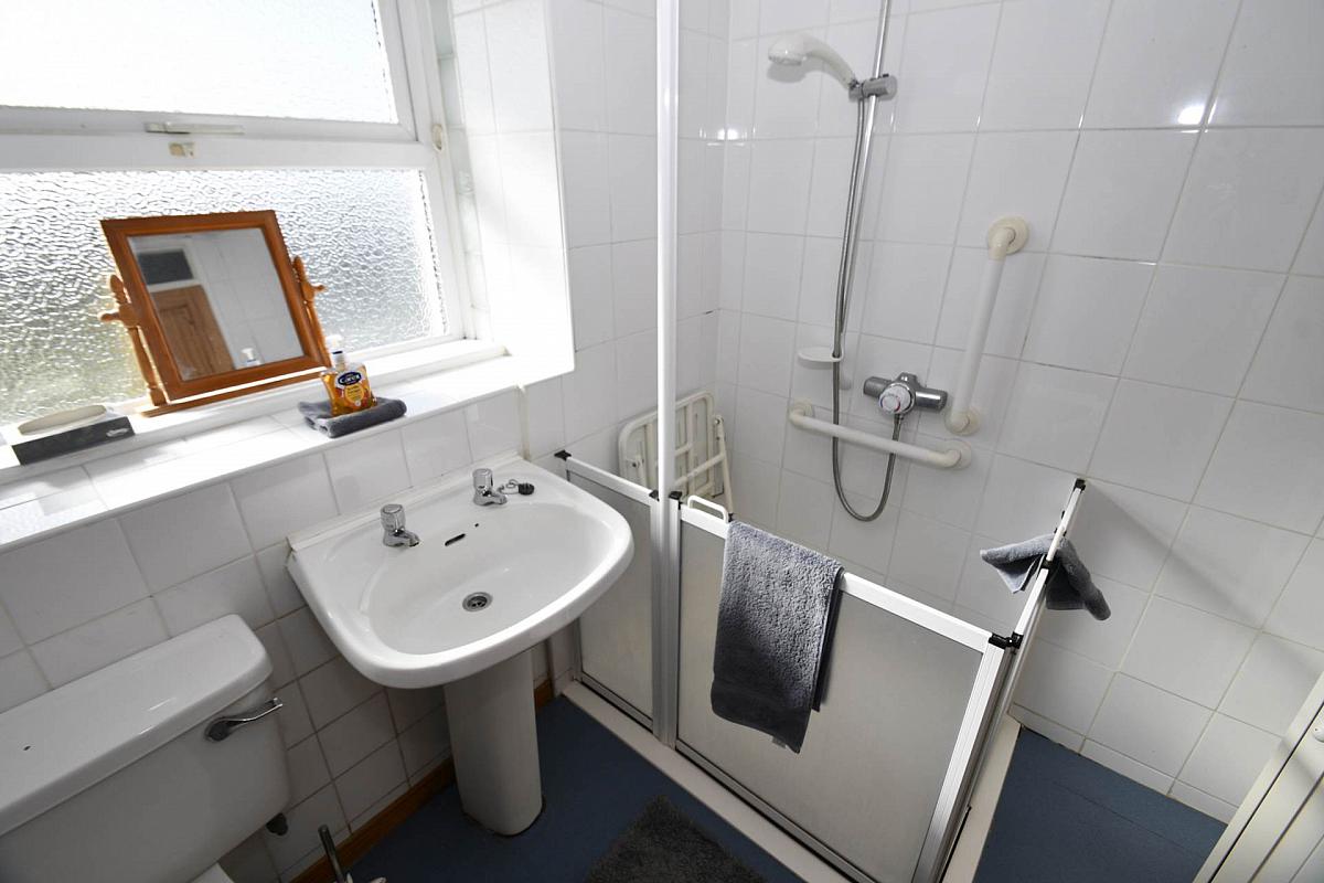 White suite comprising of panel walk in shower with pedestal wash hand basin, low flush WC, part tiled walls, anti slip flooring