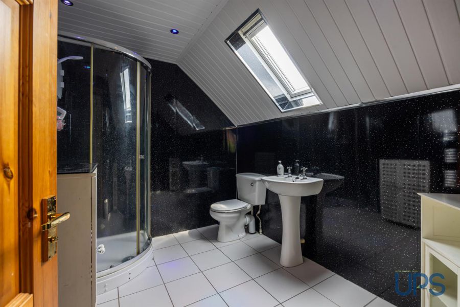 Private en-suite shower room, shower cubicle, electric shower unit, low flush w.c., pedestal wash hand basin, chrome effect sanitary ware, Velux window, chrome effect towel warmer, spotlights, extractor fan, pvc paneled walls, tiled floor;