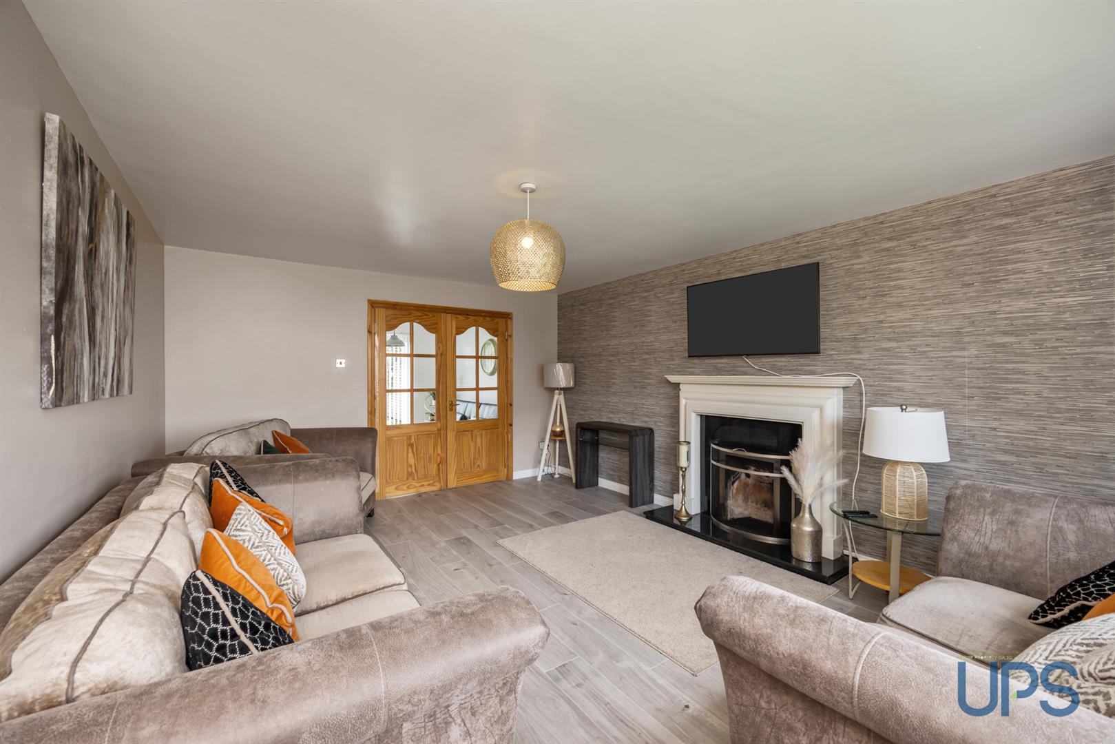 Attractive fire place, double doors to;